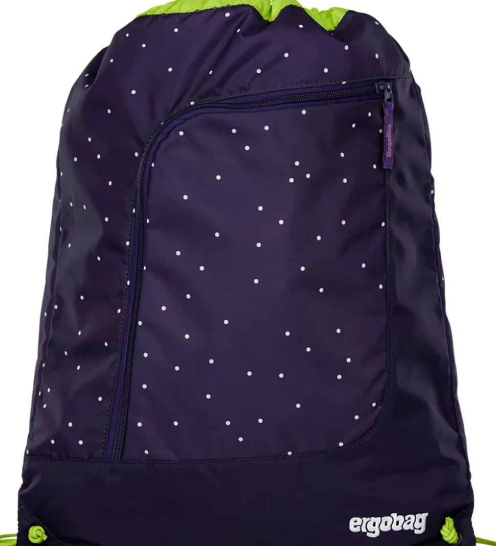 Ergobag gymnastikposen lukkes til i toppen ved at stramme snørerne ind. Fortil er der et mindre rum, som lukkes med en lynlås. Gymnastikposen kan klikkes fast uden på Ergobag skoletaskerne med klikspænderne i toppen og nederst på skulderremmene.