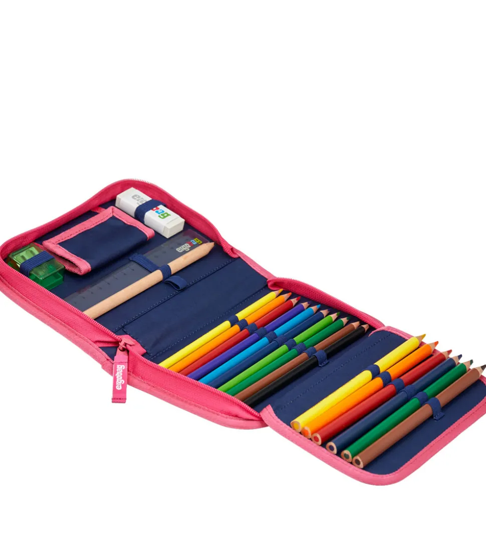 Ergobag penalhuset åbnes med en lynlås, og det indeholder masser af tilbehør i god kvalitet fra Lyra.