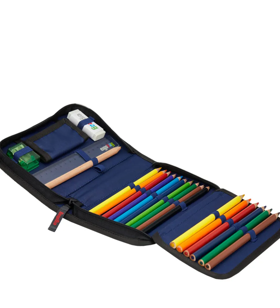 Ergobag penalhuset åbnes med en lynlås, og det indeholder masser af tilbehør i god kvalitet fra Lyra.