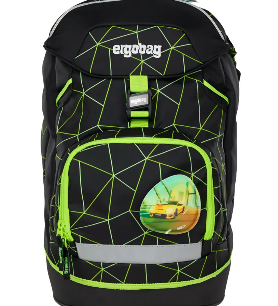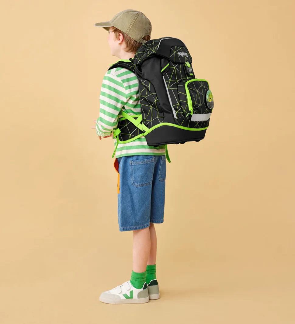 Lækker Ergobag skoletaske i sort med et neongrønt mønster.