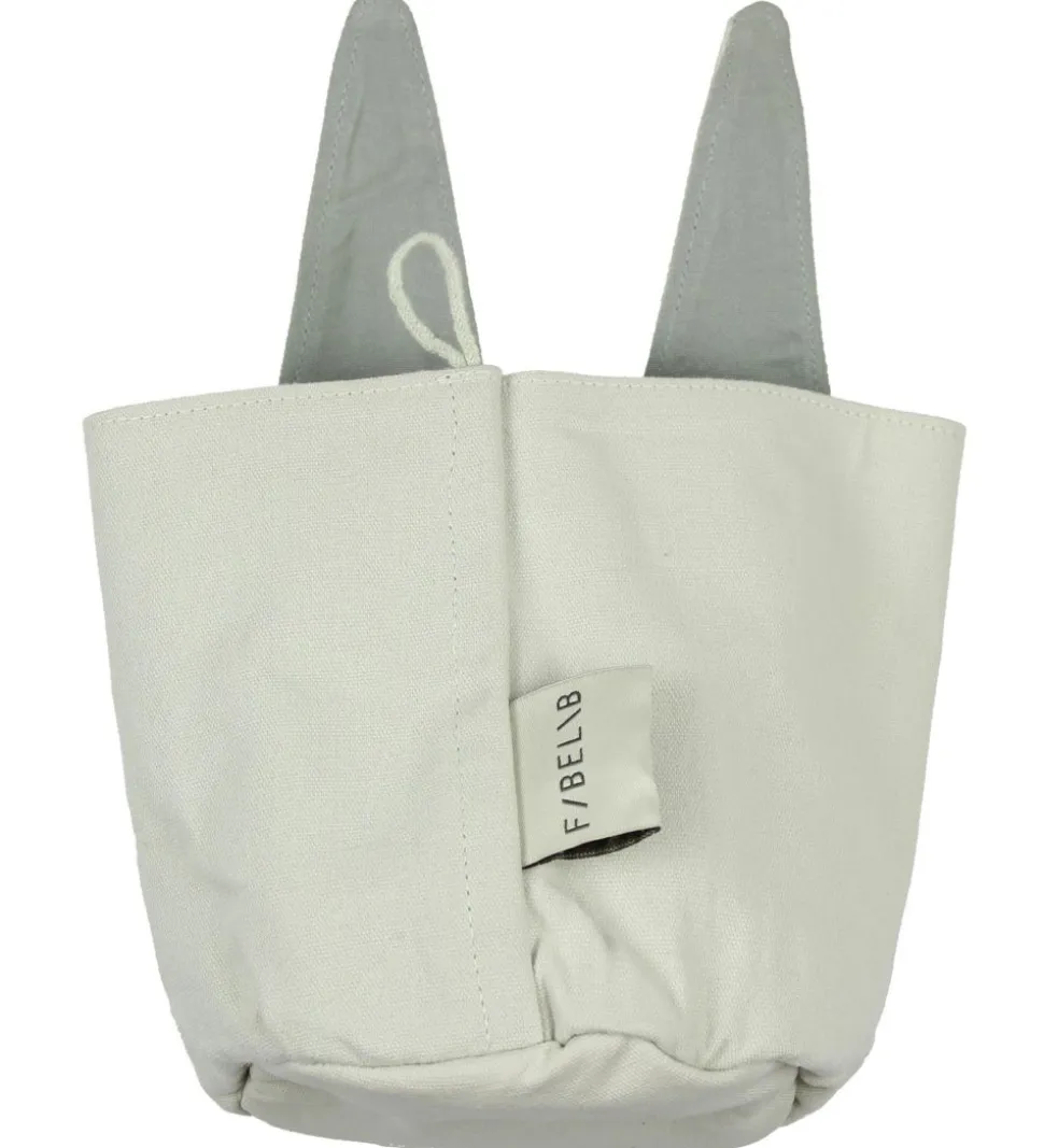 Sjov Fabelab opbevaringspose i tekstil i hvid med et lysegråt for. I toppen er der to lange kaninører.