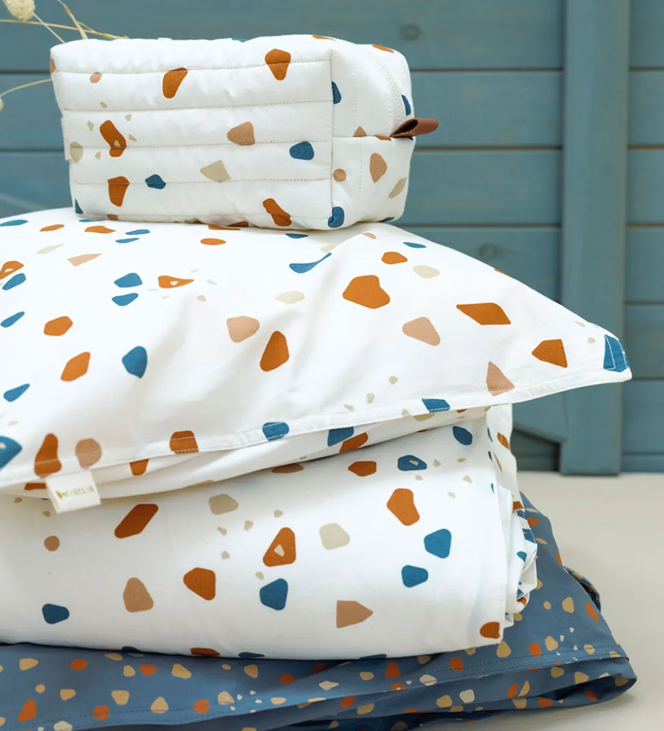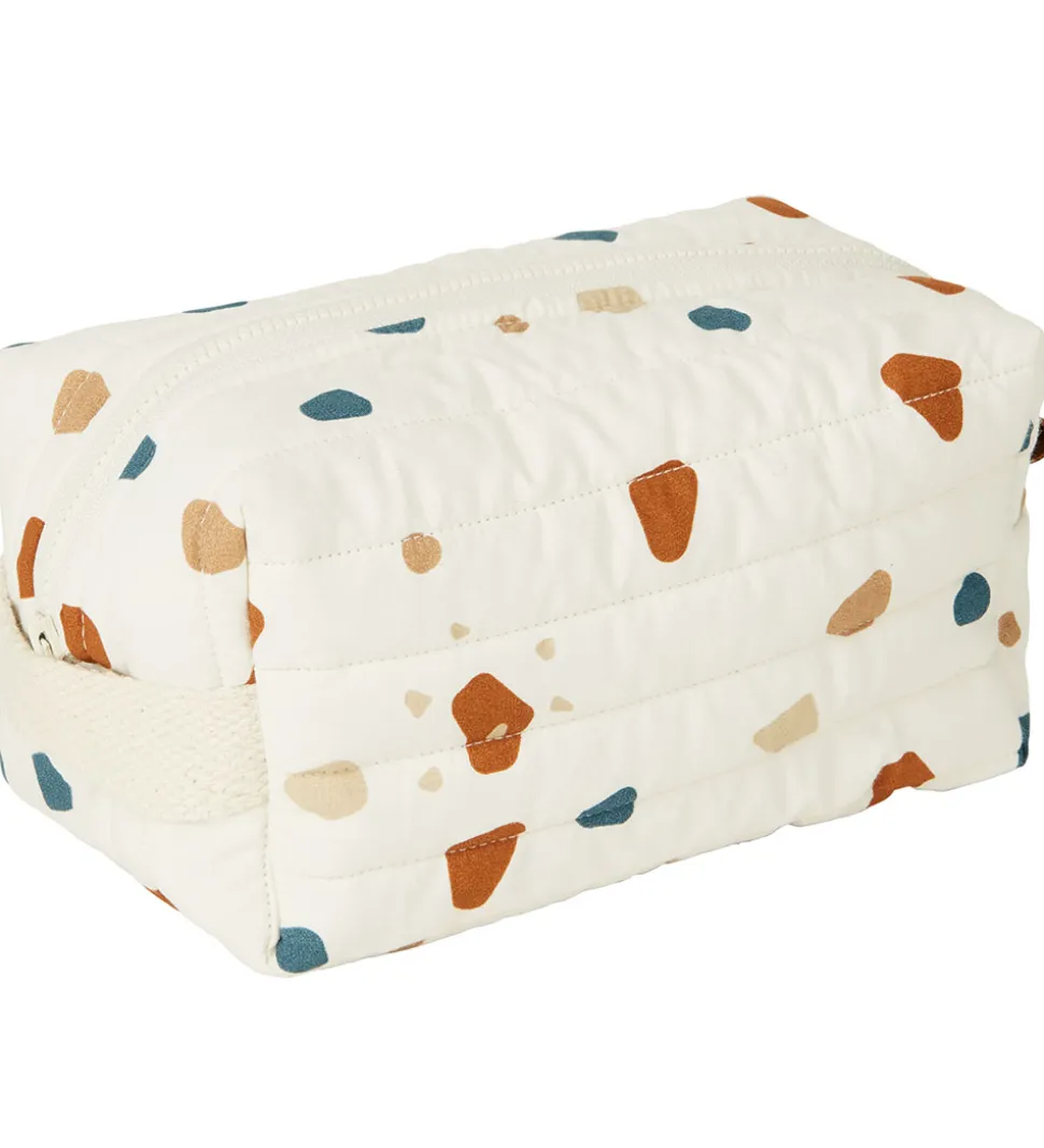 Flot Fabelab toilettaske i cremehvid med et allover-terazzoprint i brune, beige og mørkeblå nuancer. Toilettasken er i et dyne-design med lodrette syninger og en let vattering.