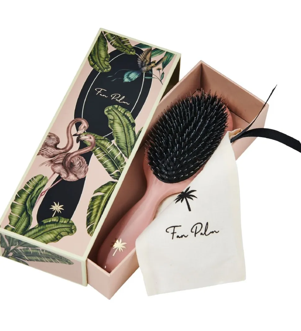 Fan Palm børsten har bløde og skånsomme vildsvinehår samt længere nylonbørster, for at stimulere hovedbunden og hjælpe mod filtret hår, mens vildsvinehårene optager hårets naturlige olie og fordeler olien ud i længden af håret. Det stimulerer blodgennemstrømningen til hårsækkene, og de fleste oplever at de kan reducere hyppigheden af hårvask til hver tredje eller fjerde dag.
