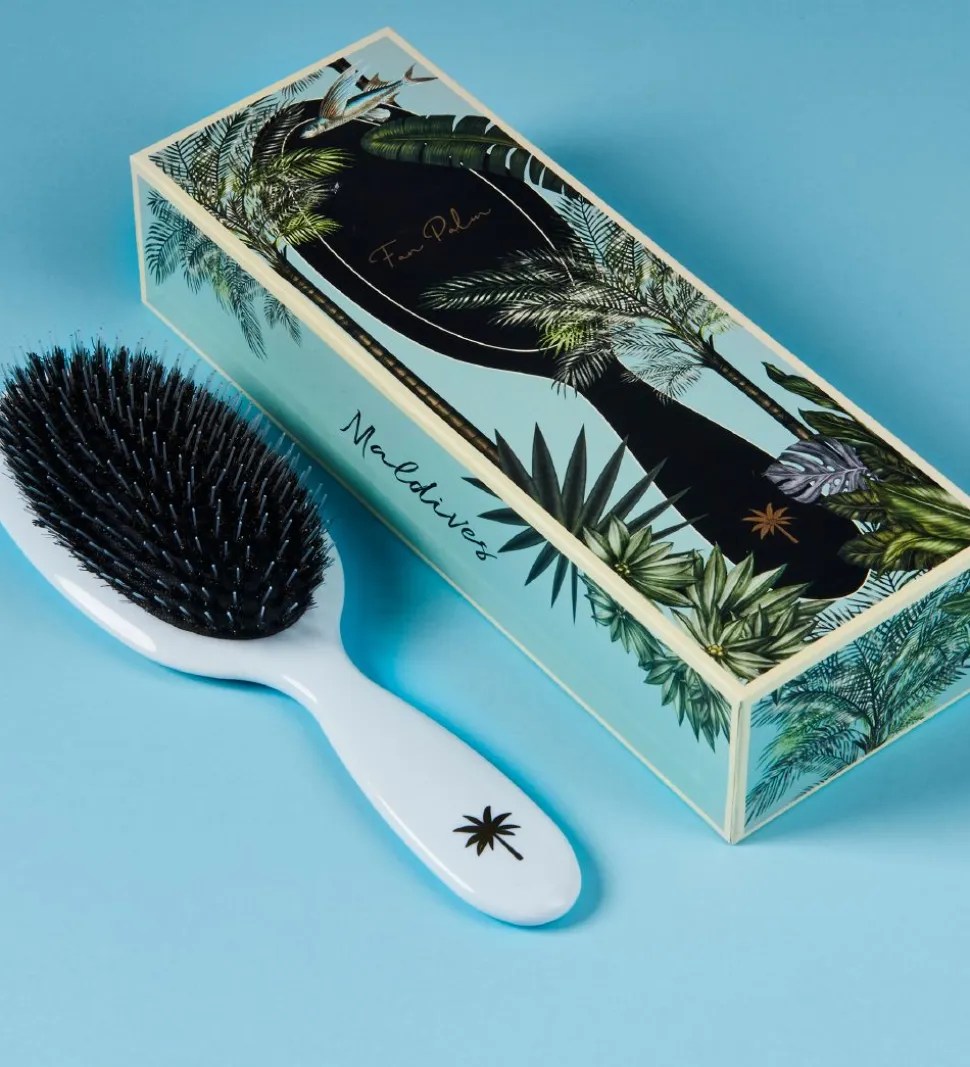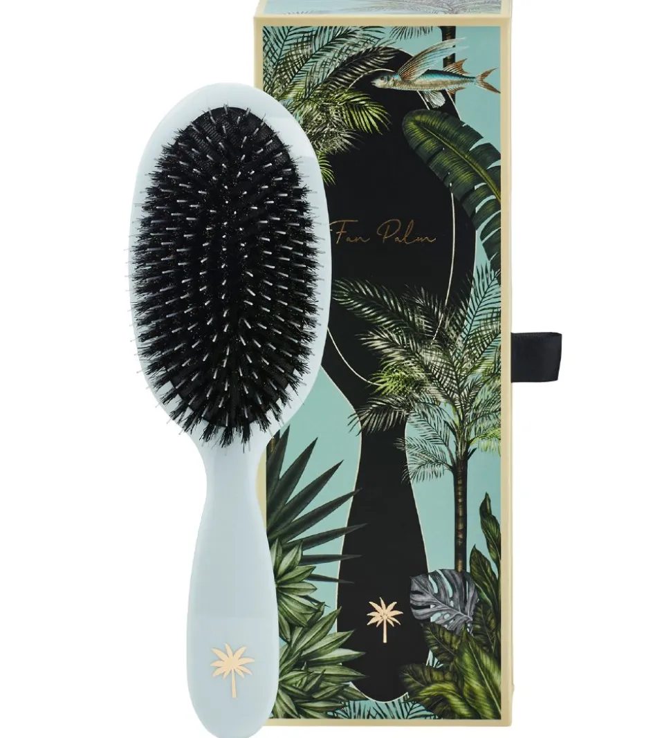 Fan Palm børsten har bløde og skånsomme vildsvinehår samt længere nylon børster, for at stimulere hovedbunden og hjælpe mod filtret hår, hvor de kortere vildsvinehår hjælper med at distribuere de naturlige olier i håret.