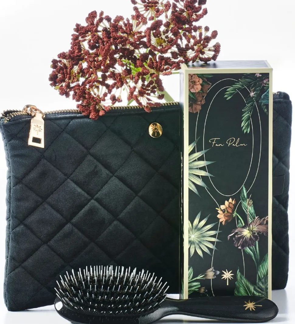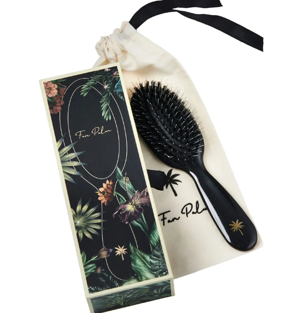 Fan Palm børsten har bløde og skånsomme vildsvinehår samt længere nylon børster, for at stimulere hovedbunden og hjælpe mod filtret hår, hvor de kortere vildsvinehår hjælper med at distribuere de naturlige olier i håret.