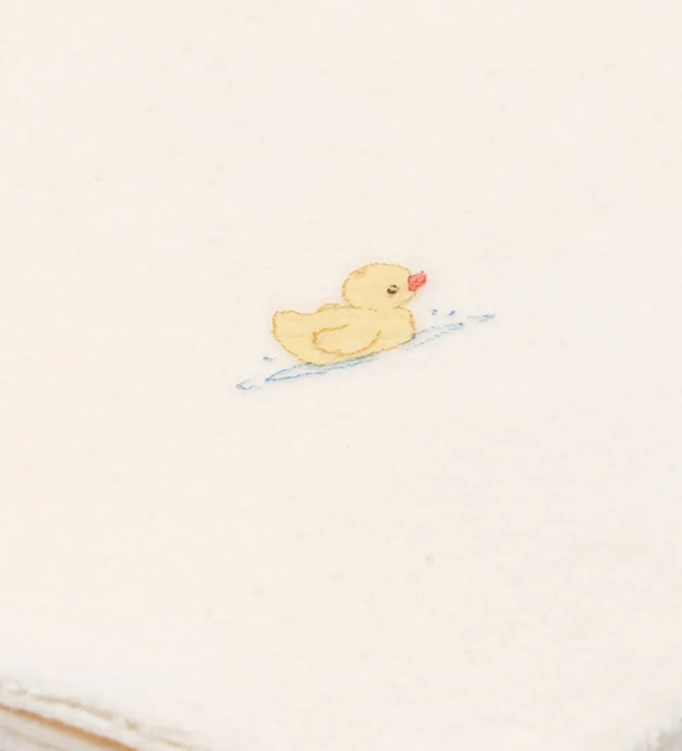 Blødt Fanga Fontana babytæppe i cremehvidt velour og med et fint print af en lille and i det ene hjørne. Fanga Fontana tæppet fungerer perfekt som omsvøb eller som underlag. Perfekt til afslapning og hygge