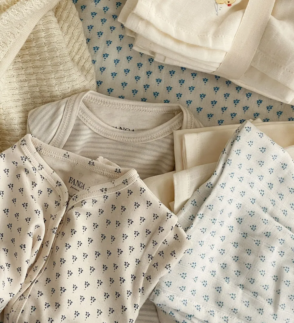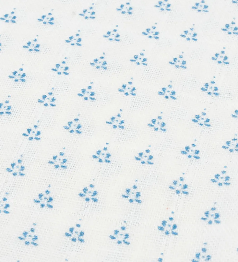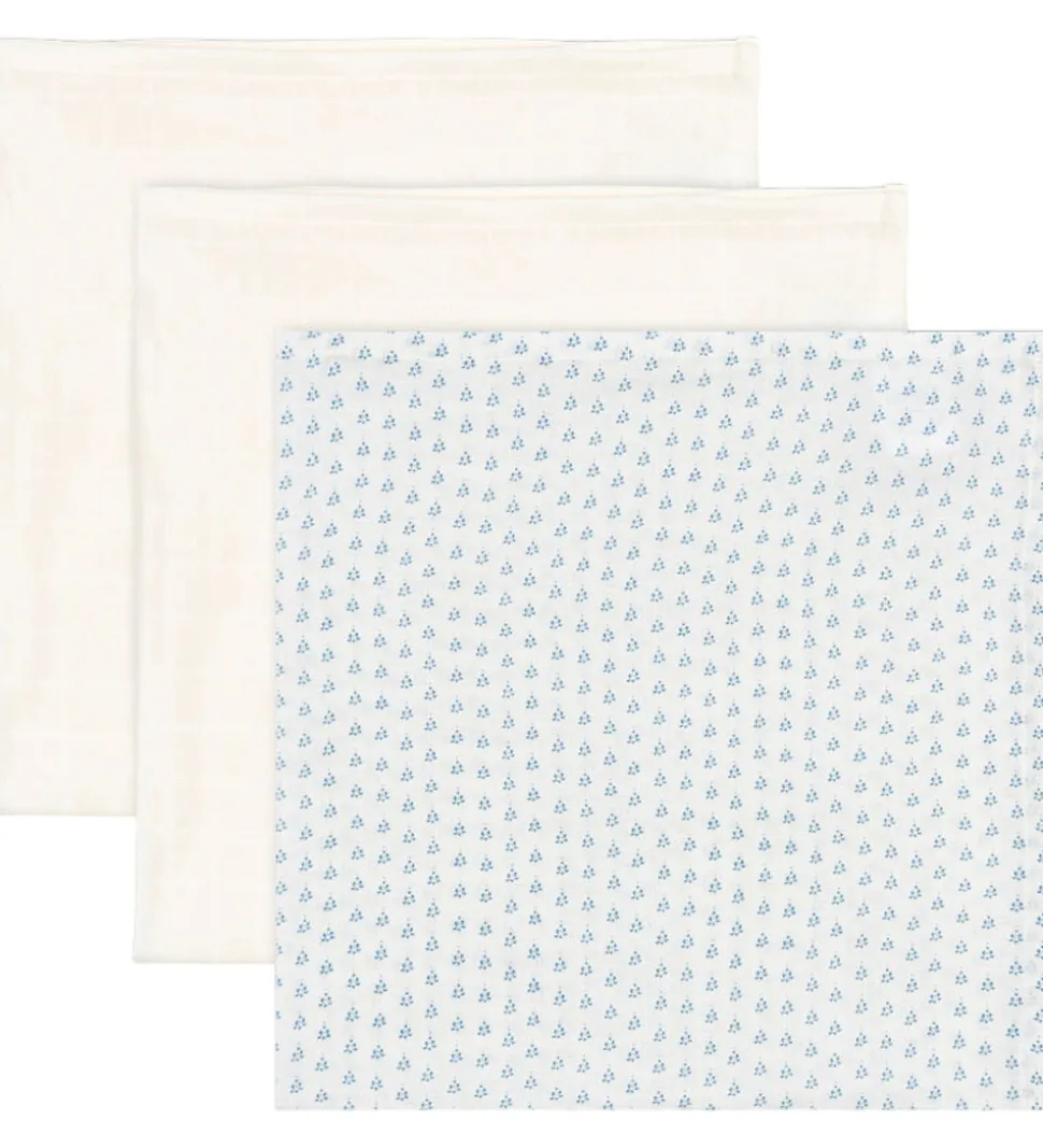 Praktiske Fanga Fontana stofbleer i en 3-pak med to ensfarvede i cremevhid og en med et mønster af små, blå motiver. Fanga Fontana stofbleerne er kvadratiske og har en blød musselin-struktur, der er velegnet til forskellige formål.