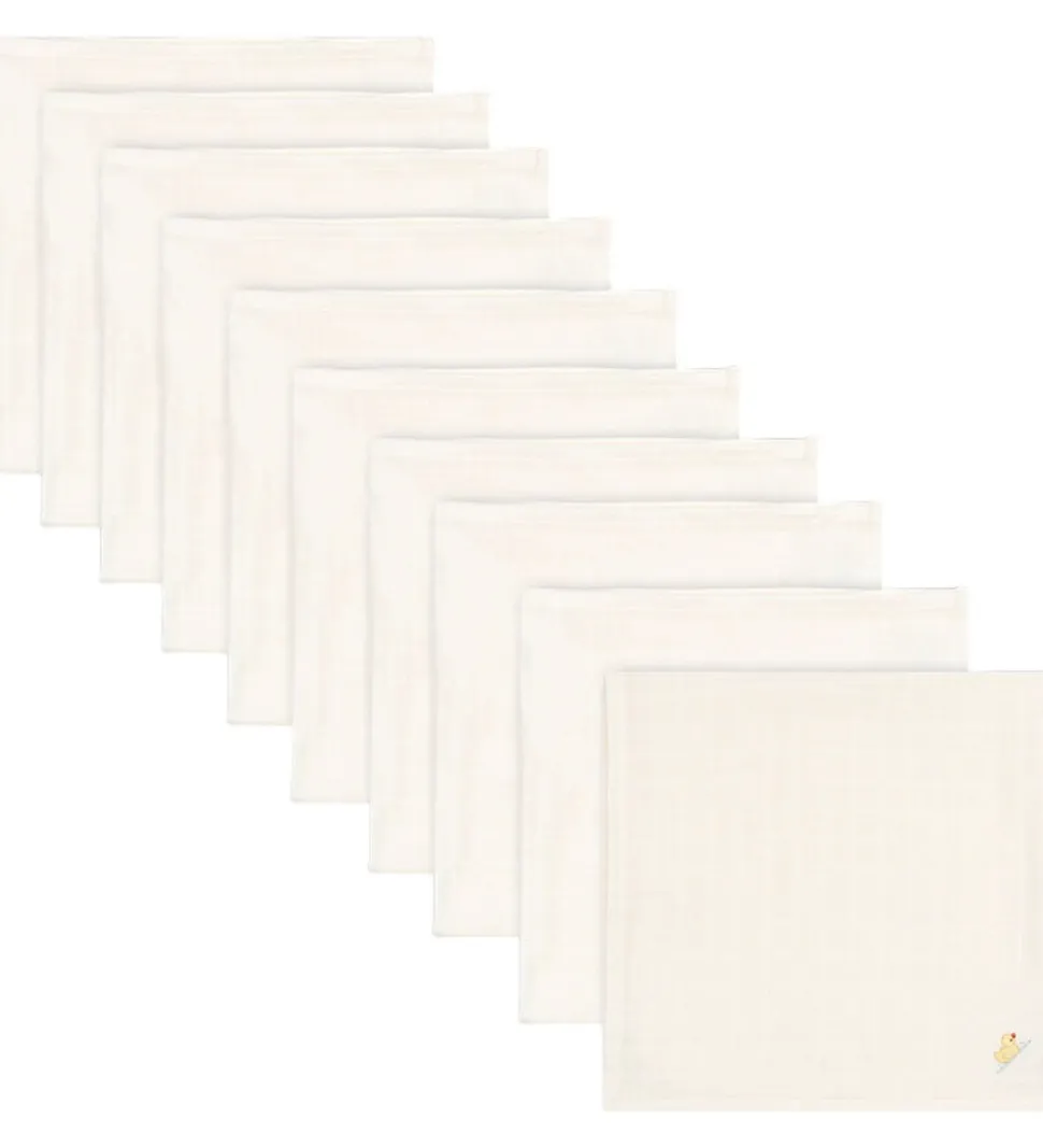 Praktiske Fanga Fontana stofbleer i en 10-pak i ensfarvet cremehvid. Fanga Fontana stofbleerne er kvadratiske og har en let musselin-struktur i stoffet. Hver stofble er fremstillet med omhyggelig syning langs kanterne, hvilket sikrer en holdbar kvalitet.