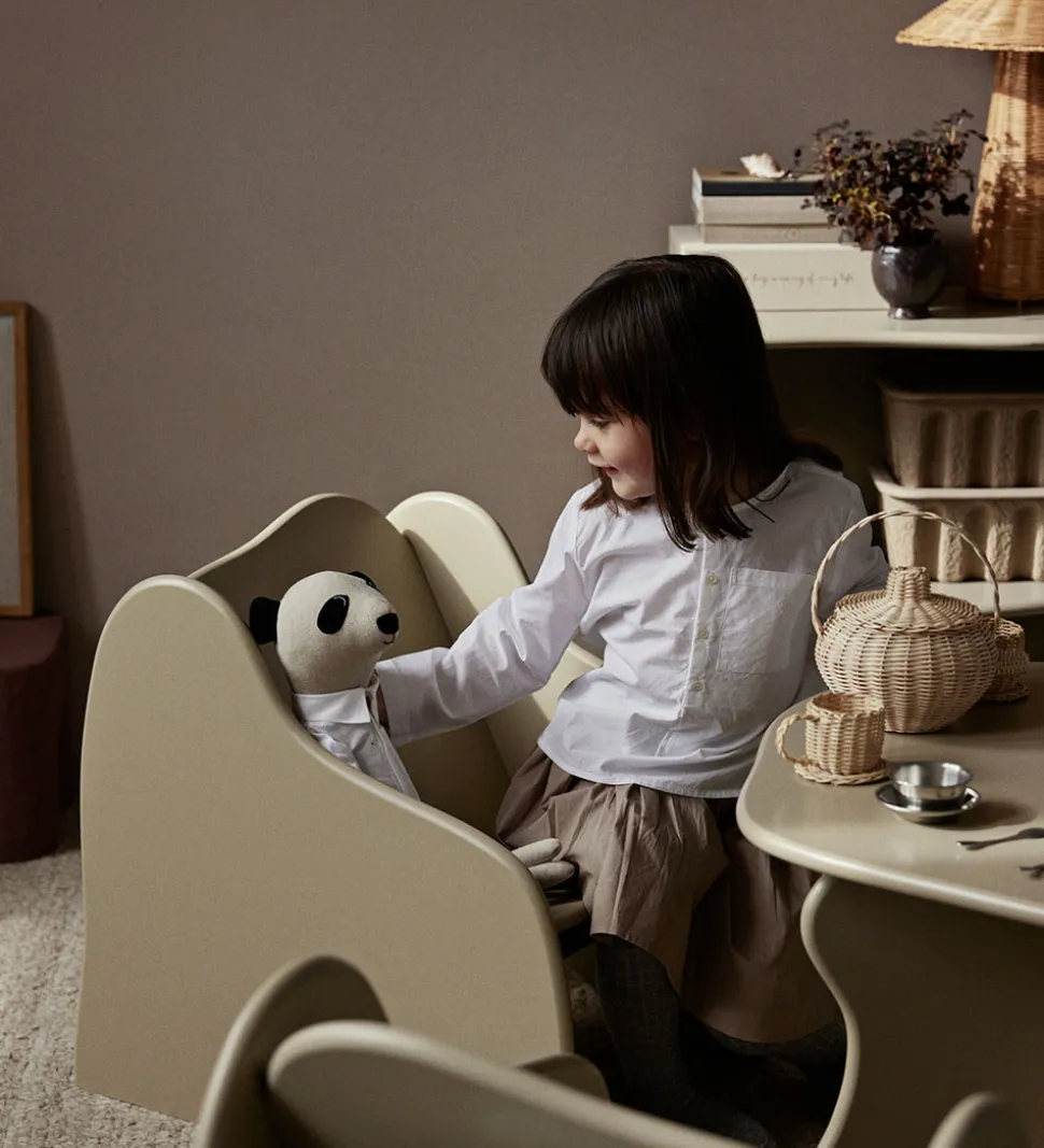 ferm Living stolen er lavet som en loungestol og helt perfekt at slænge sig i med en god bog. På stolens ryg er der integreret en fin boghylde, som er ideel til at skabe et hyggeligt læsehjørne eller en hyggekrog på børneværelset.