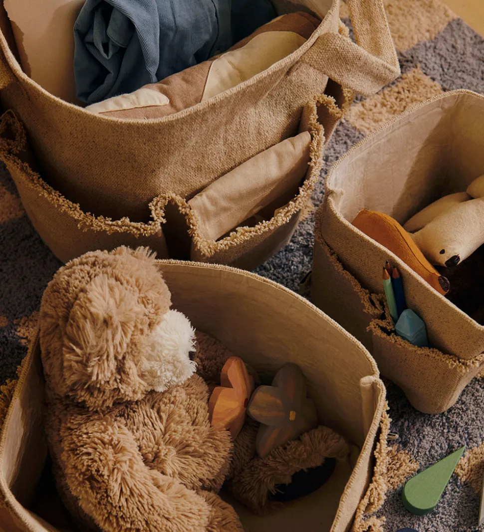 Ferm Living opbevaringskurven er fremstillet af kraftigt bomuld og består af én stor lomme med seks udvendige lommer, hvilket gør den funktionel til organisering i hjemmet. Derudover har den to solide håndtag, som gør den nem at flytte rundt.