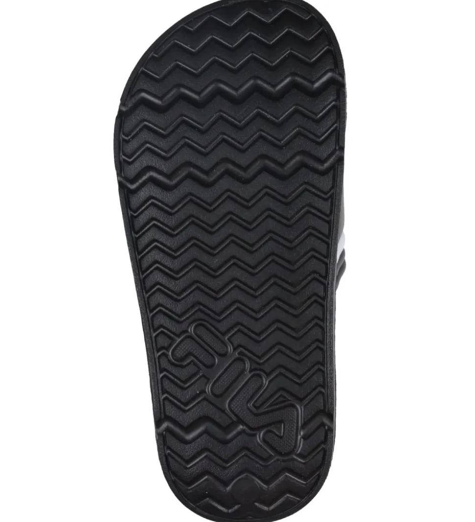 Lækre Fila badesandaler i sort. På hver rem står der Fila i hvid og rød.