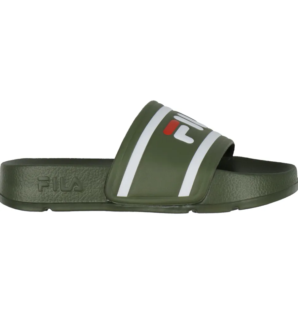 Flotte Fila badesandaler i armygrøn med to hvide striber og et stort logo i hvid og rød.