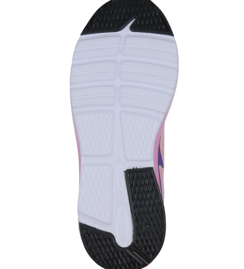 Flotte Fila sko i en kombination af to rosa nuancer, koralrød og blå. Ydersålerne graduerer i farven fra mørk rosa til hvid.