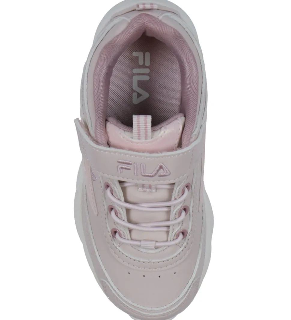 Fila skoene har elastiske snøre over vristen og lukkes øverst med en velcrorem. Skoene har mørk rosa tekstil på indersiden, og de har bløde, udtagelige indersåler. Skoene har kraftige og fleksible ydersåler, som er lavet i et letvægtigt materiale.