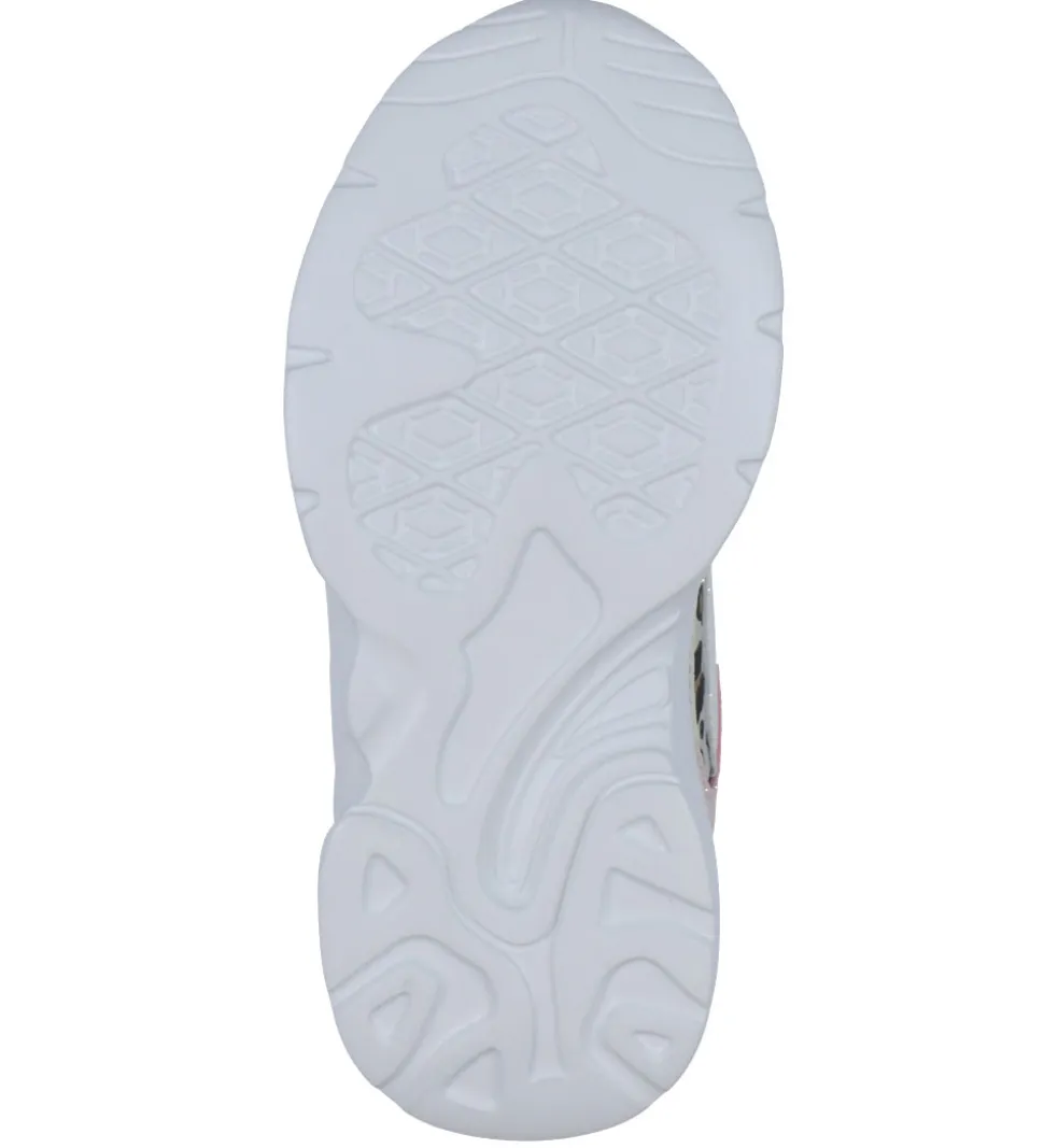 Smarte Fila sko i beigefarvet og rosa imiteret skind samt beigefarvet, imiteret ruskind med et leopardprint i brun g og sort. Skoene har små refleksdetaljer og hvide ydersåler.