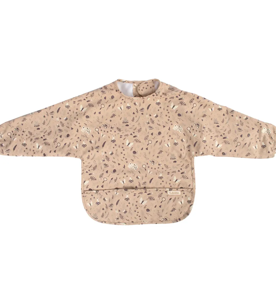 Filibabba forklædet har lange ærmer og åbnes i nakken med velcro. Fortil er der en lomme i bunden til at opsamle spildt mad og drikke. I armåbningerne er der smalle elastikkanter og indvendigt er der blødt for.