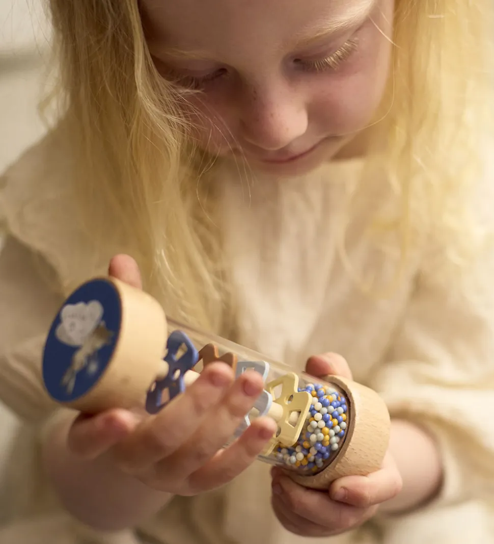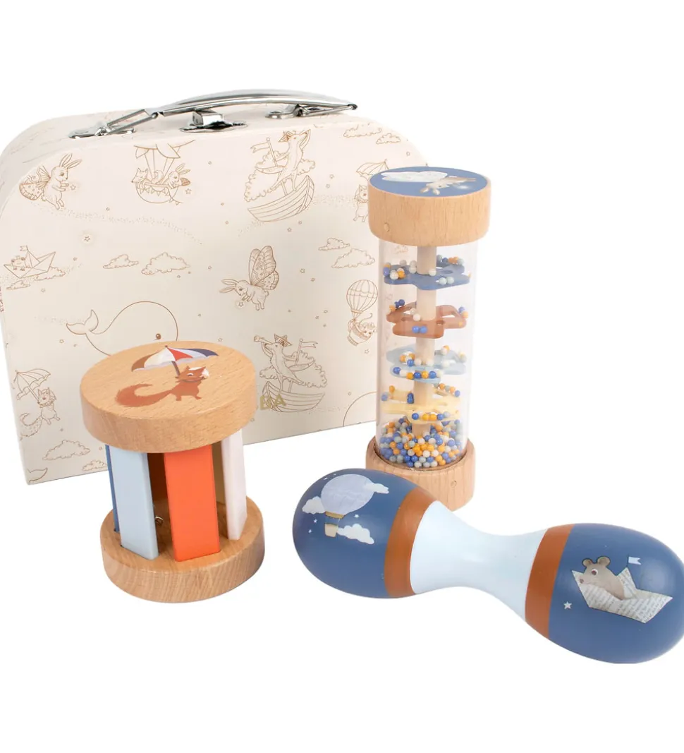 Fin legekuffert i lyseblå med fantasifuldt dyreprint i brun. Kufferten indeholder tre rangler i træ med fine farver.