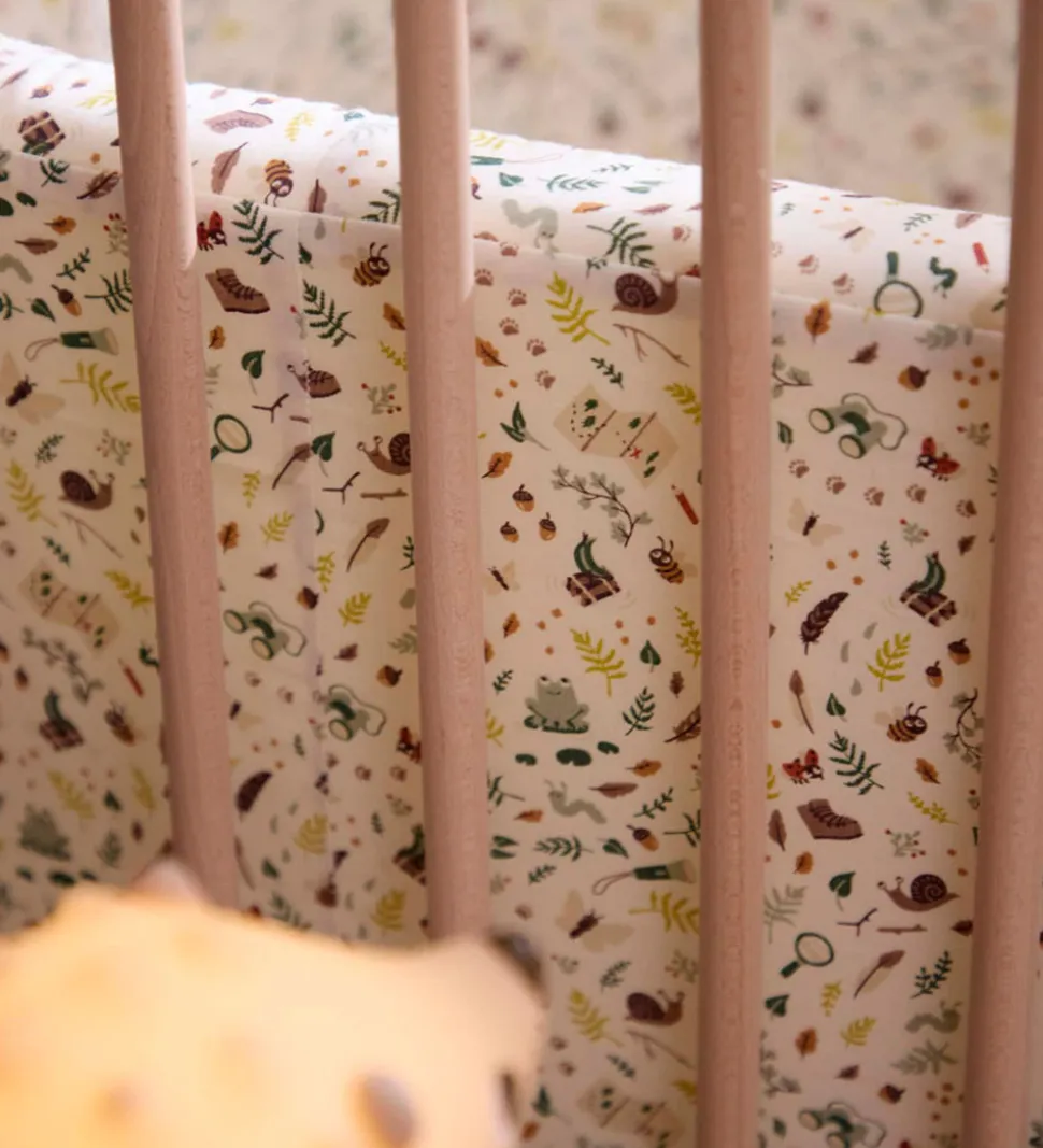 Flot Filibabba sengerand i hvid med et farverigt alloverprint af smådyr, planter og blomster, kikkerter og en helt masse andet.