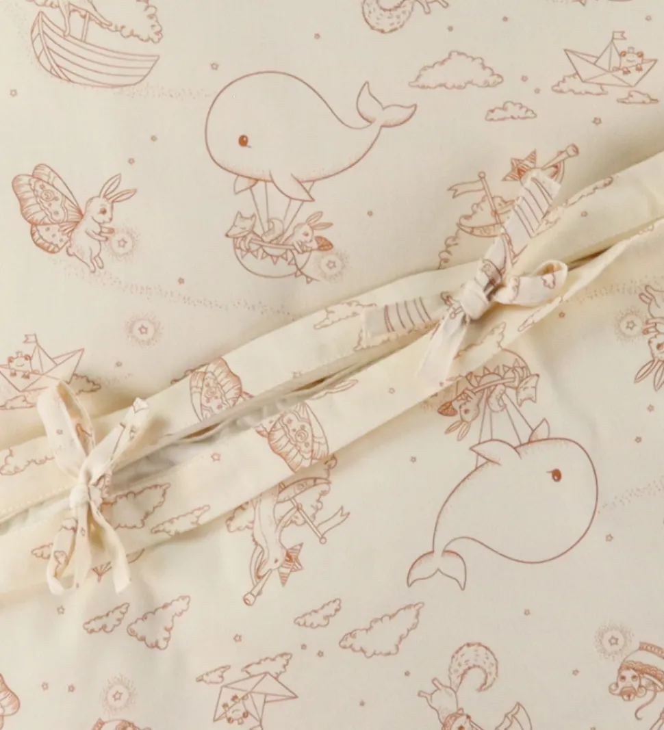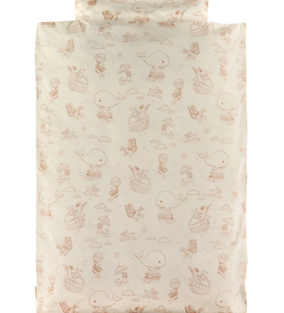 Lækkert Filibabba sengetøj i beige med et drømmende print af luftballoner og søde dyremotiver i orange.
