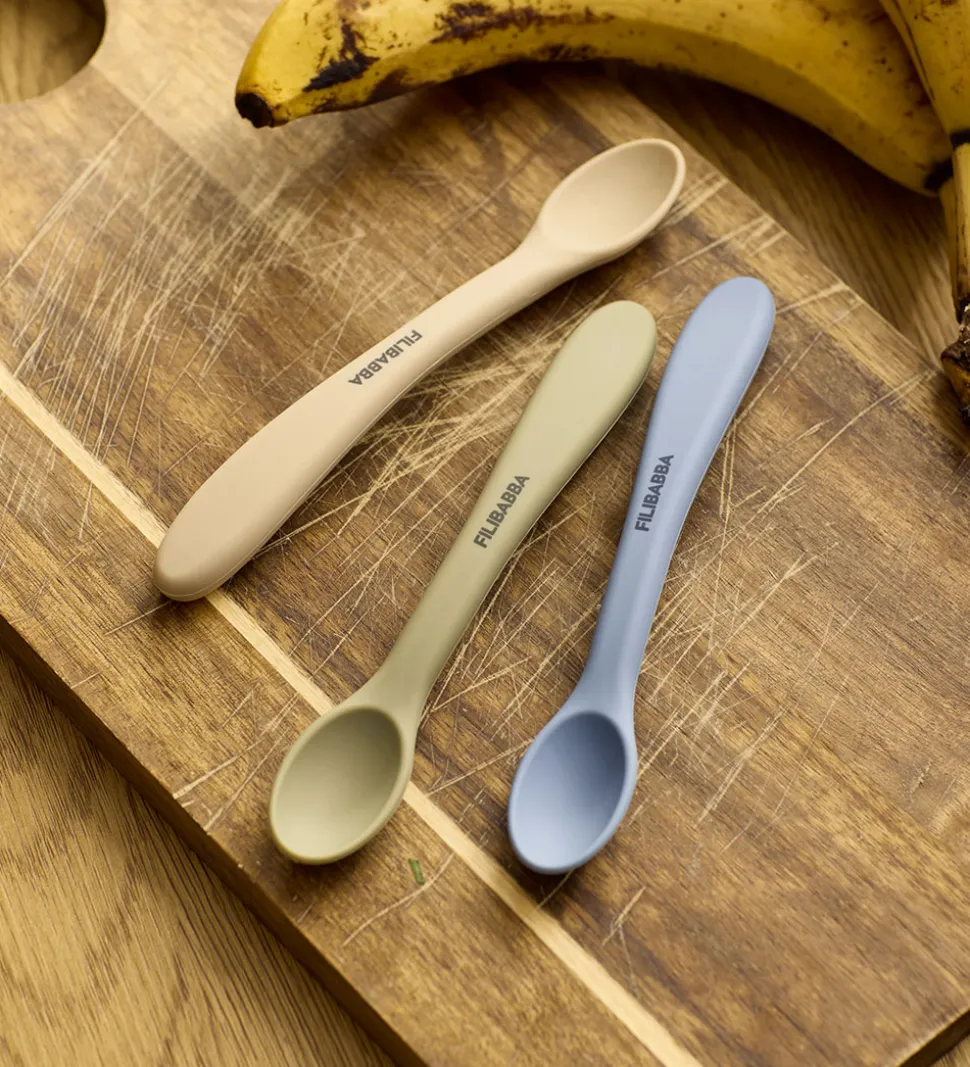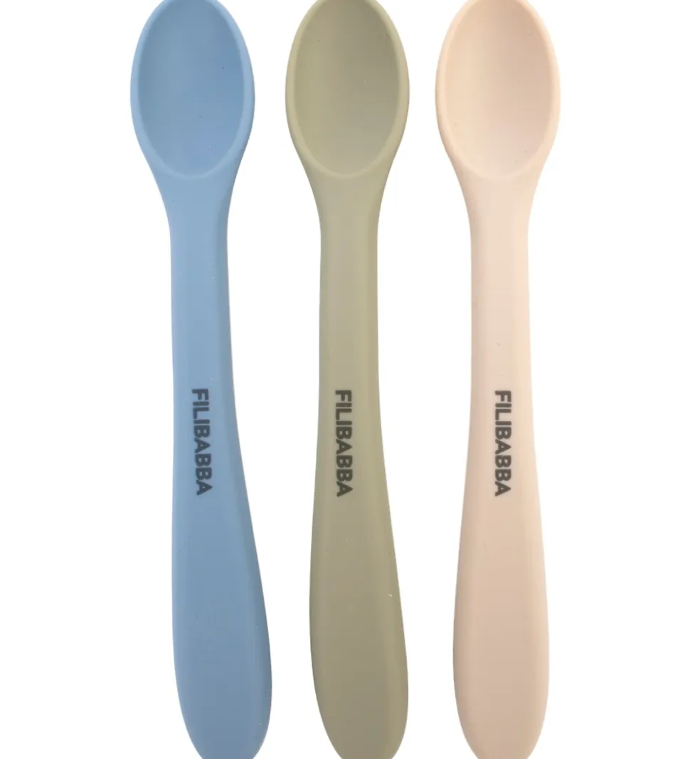 Smarte Filibabba skeer solgt i en 3-pak i beige, grøn og blå med logo på hver ske. Skeerne har et skaft som er let at holde om og et lille skehoved. Skeerne er fremstillet af silikone, så de er behagelige at få i munden.