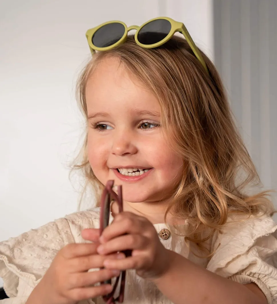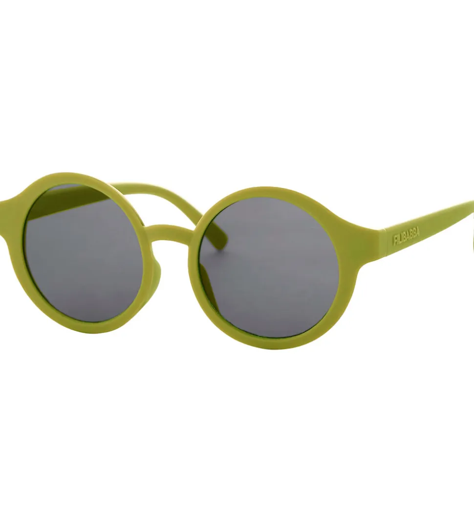 Fine Filibabba solbriller i grøn med runde, mørke brilleglas.