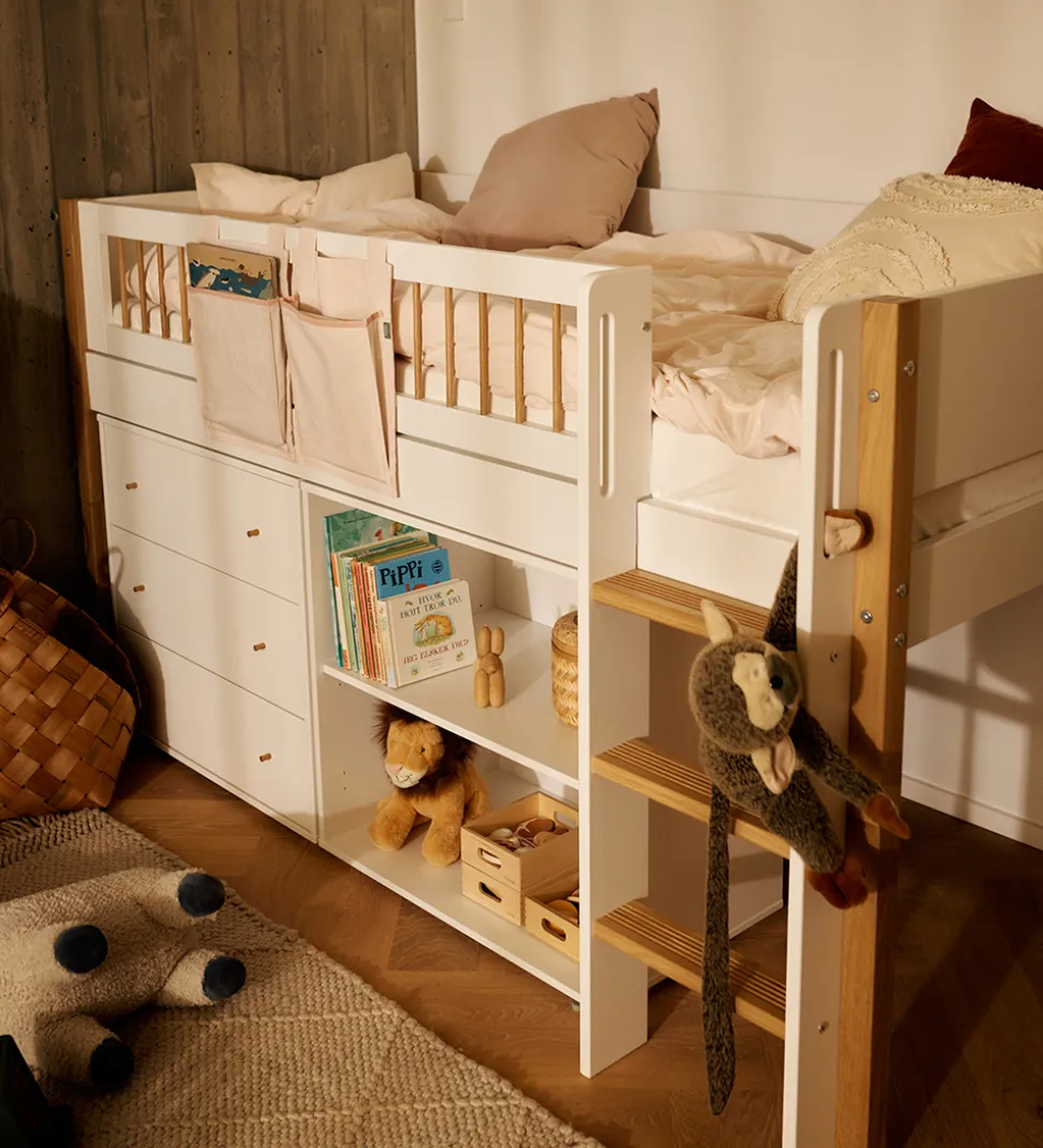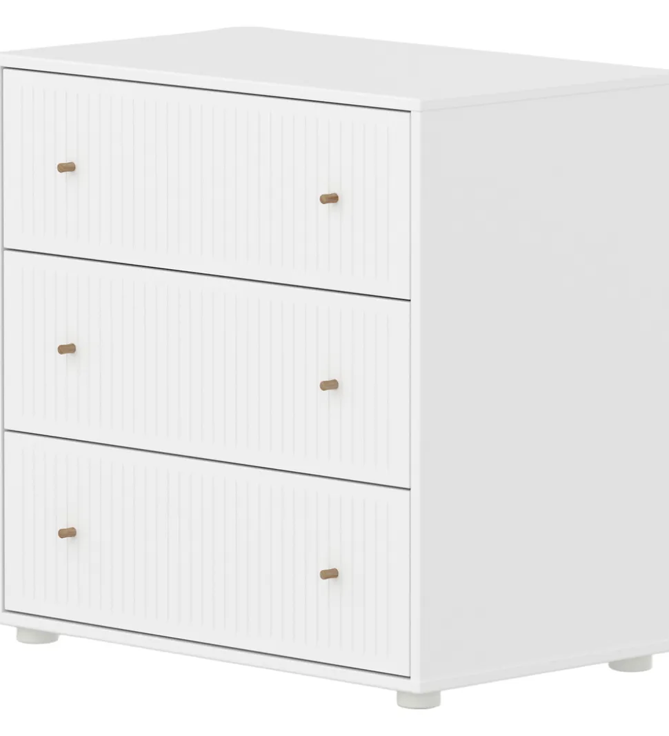 Flexa kommoden har tre skuffer med dekorative riller på fronten. Skufferne har to flotte egetræsgreb på fronten, så de er lette at åbne, og de har praktisk soft close, så små fingre ikke så let bliver klemt. Kommoden står på plastikfødder, så den ikke ridser gulvet, og den passer under den halvhøje seng fra Flexa.
