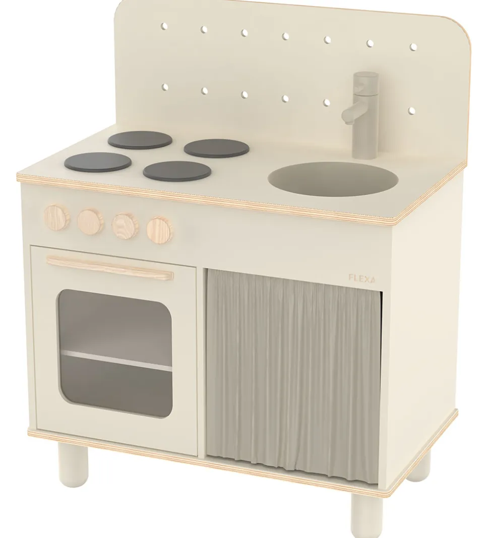 Flexa legekøkkenet består af en bordplade med fire kogeplader og en håndvask af metal en vandhane af grålakeret træ. Håndvasken kan tages op og bruges som skål. Under pladerne kan varmen justeres med drejeknapper med kliklyde. Under bordet er der en ovn med en låge, som kan åbnes, og indeni er der en plade, så der rigtig kan bages brød og kager. Ved siden af ovnen er der et køkkenskab, som bliver skjult af et mørkegråt gardin. Skabet har god plads til potter, pander og legemad. På bagvæggen er der huller med stifter, så man kan hægte alle køkkenredskaberne op på den.