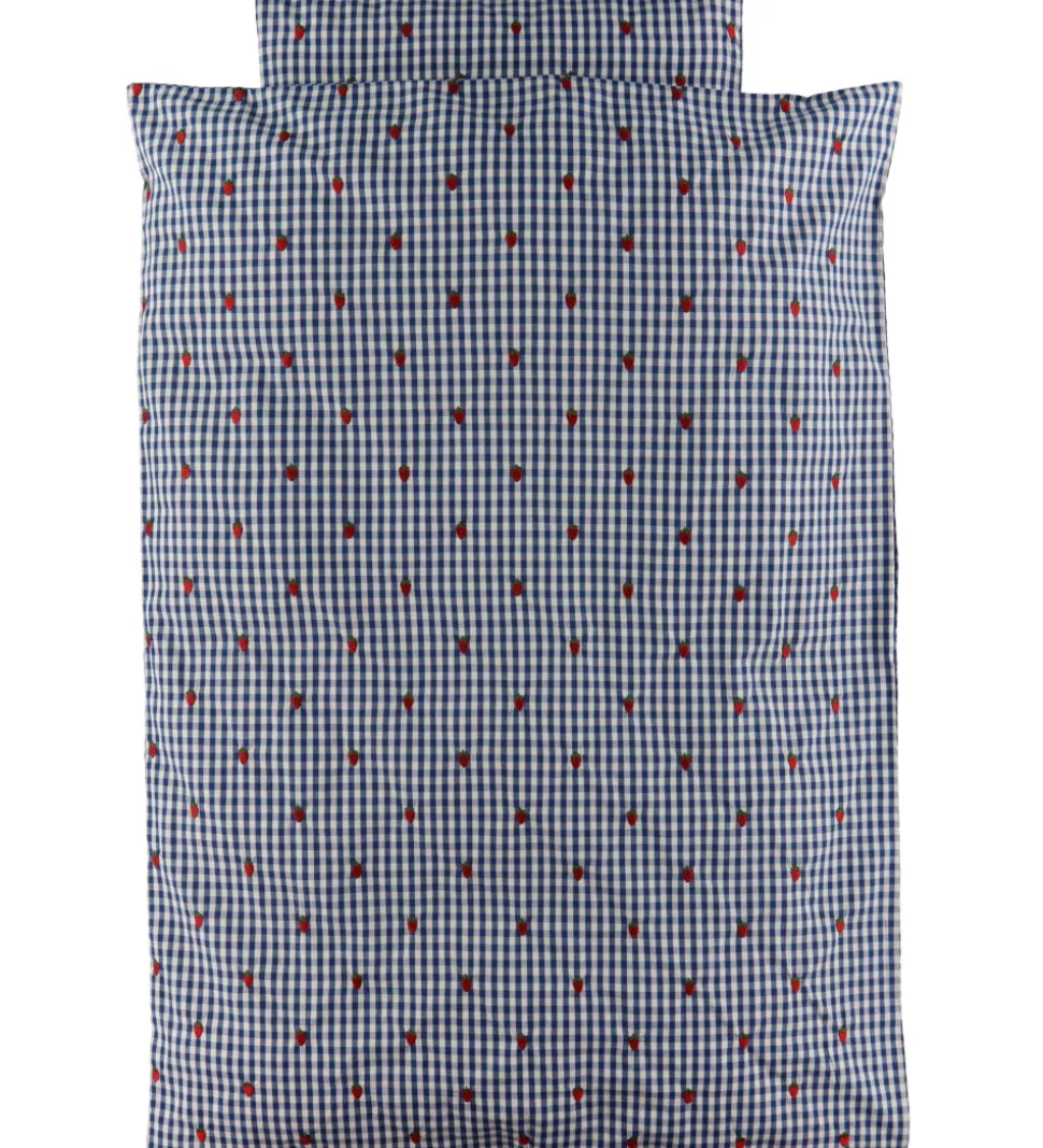 Skønt Flöss sengetøj med et klassisk, ternet mønster i blå og hvid og med søde, broderede jordbær.
