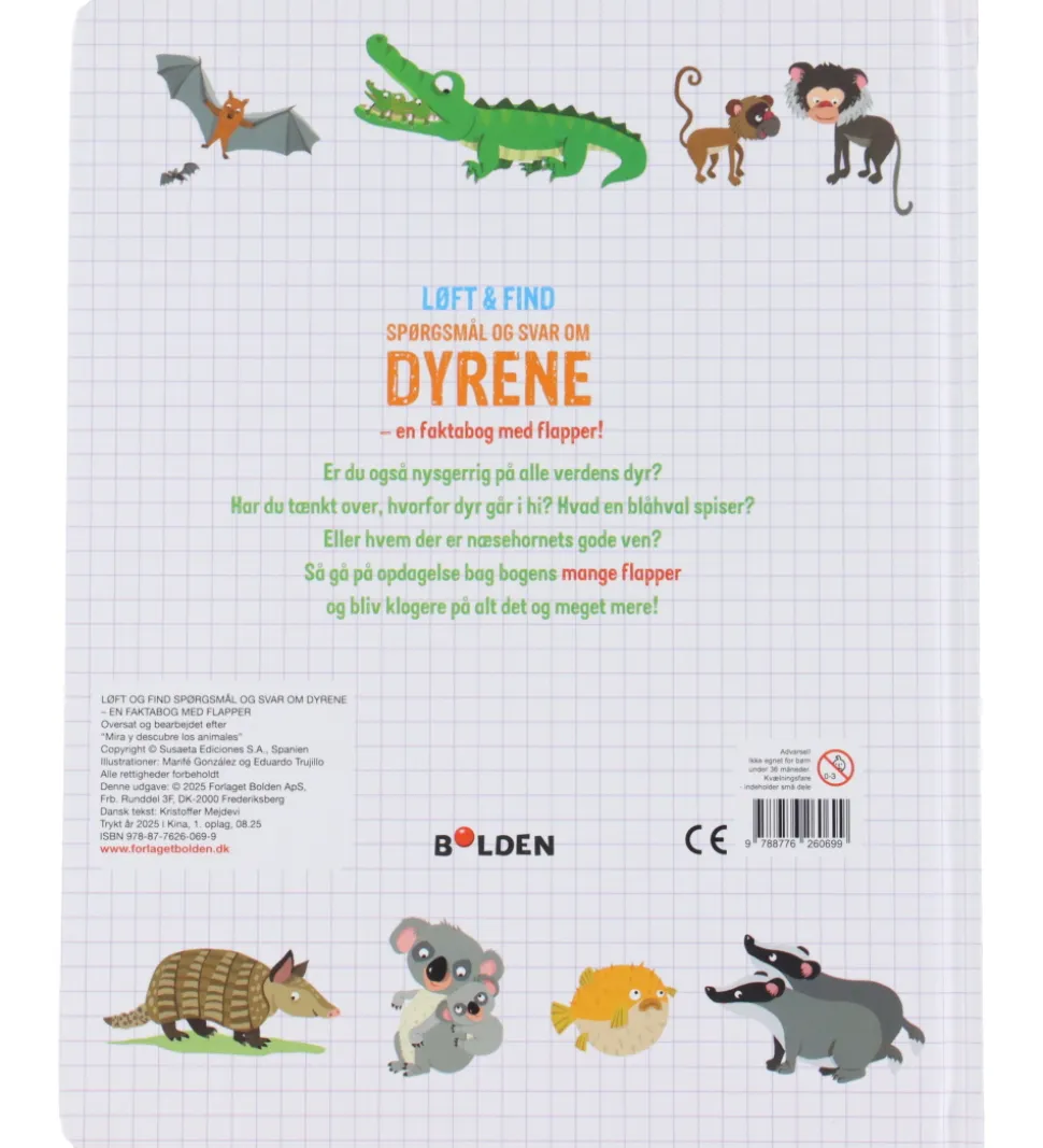Forlaget Bolden bogen er en pegebog og indeholder lærerige illustrationer med flapper og informationer, som lærer børn om dyr.