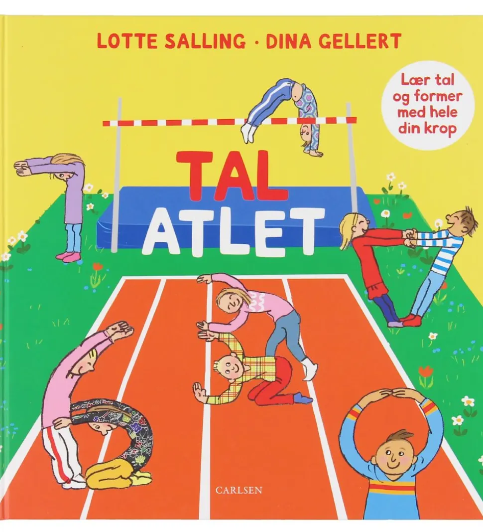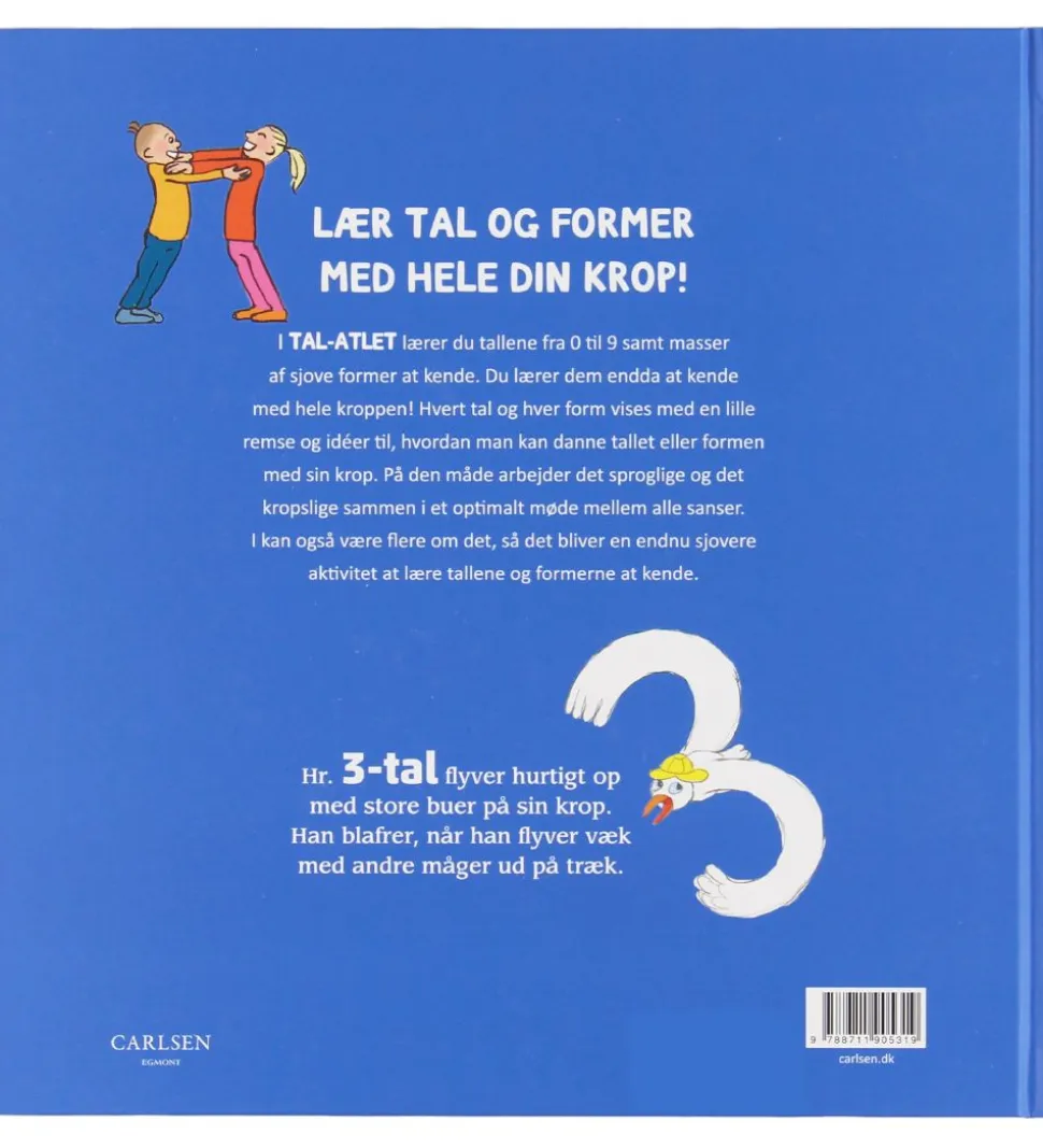 Forlaget Carlsen bogen består af en sider med en lille remse, som læses højt og herefter skal du og barnet forme tallene og formerne med kroppen. Nogle kan laves stående mens andre skal laves liggende. Der er flere forskellige forslag, så sværhedsgraden kan justeres efter dit barn.