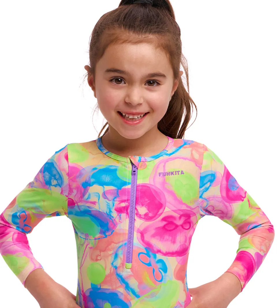 Funkita badedragten har lange ærmer og en rund halsudskæring. Den kan åbnes fortil med en lynlås med indvendig vindstolpe. I benåbningerne er der elastiske kanter, som sikrer en god pasform. Badedragten er fremstillet i en strækbar kvalitet.