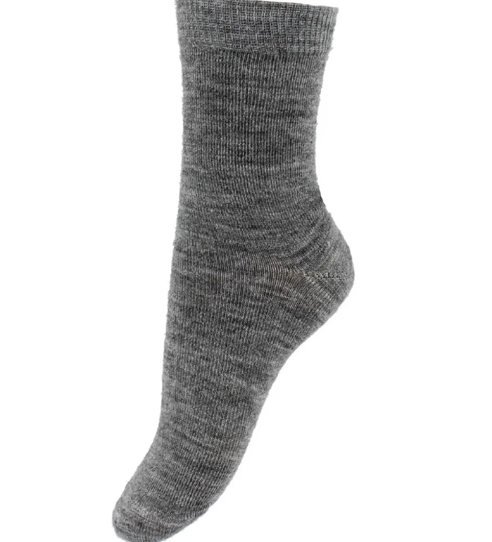 Lækre Fuzzies uldstrømper i gråmeleret nuance med et mørkegråt Fuzzies logo under foden.