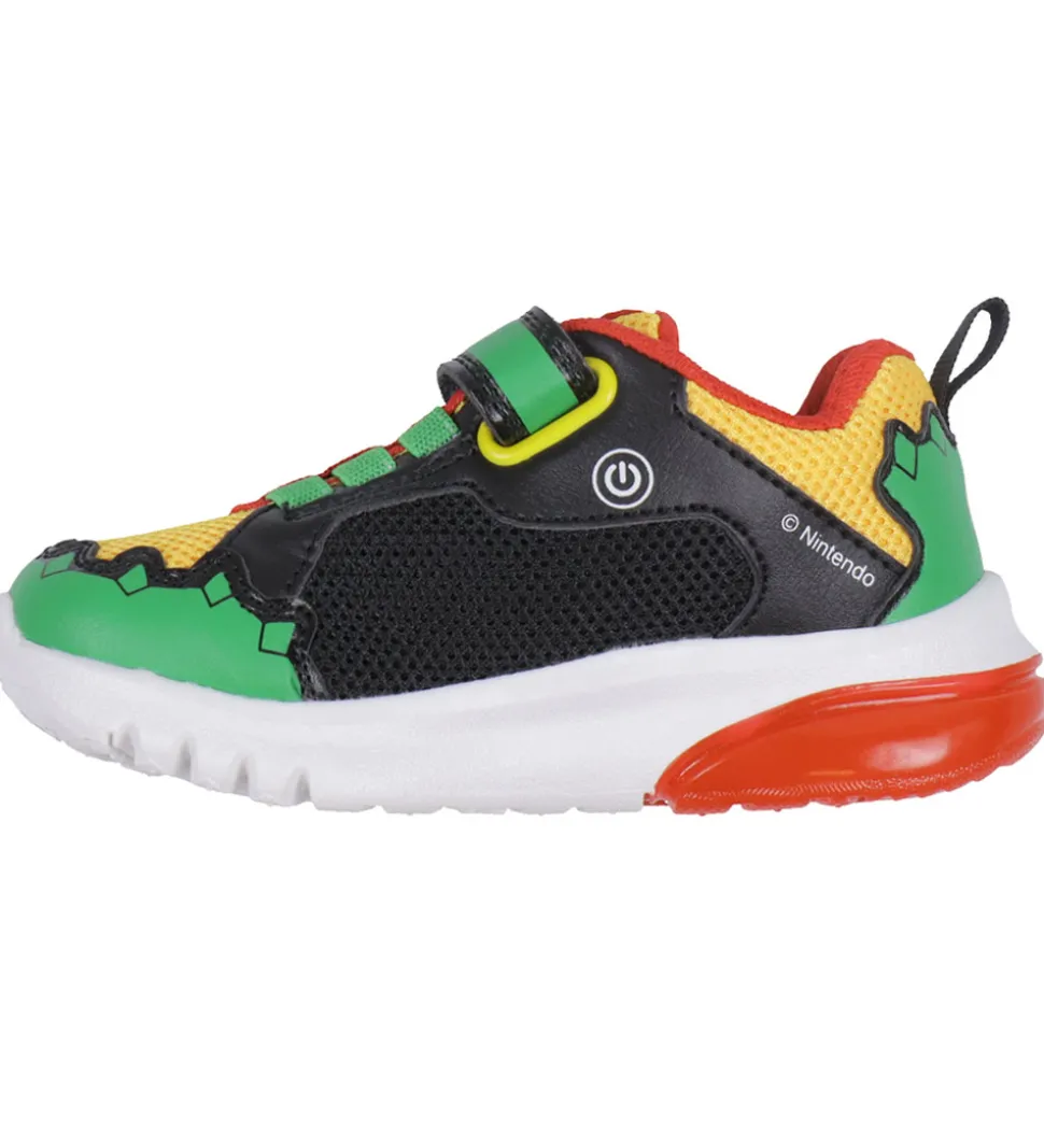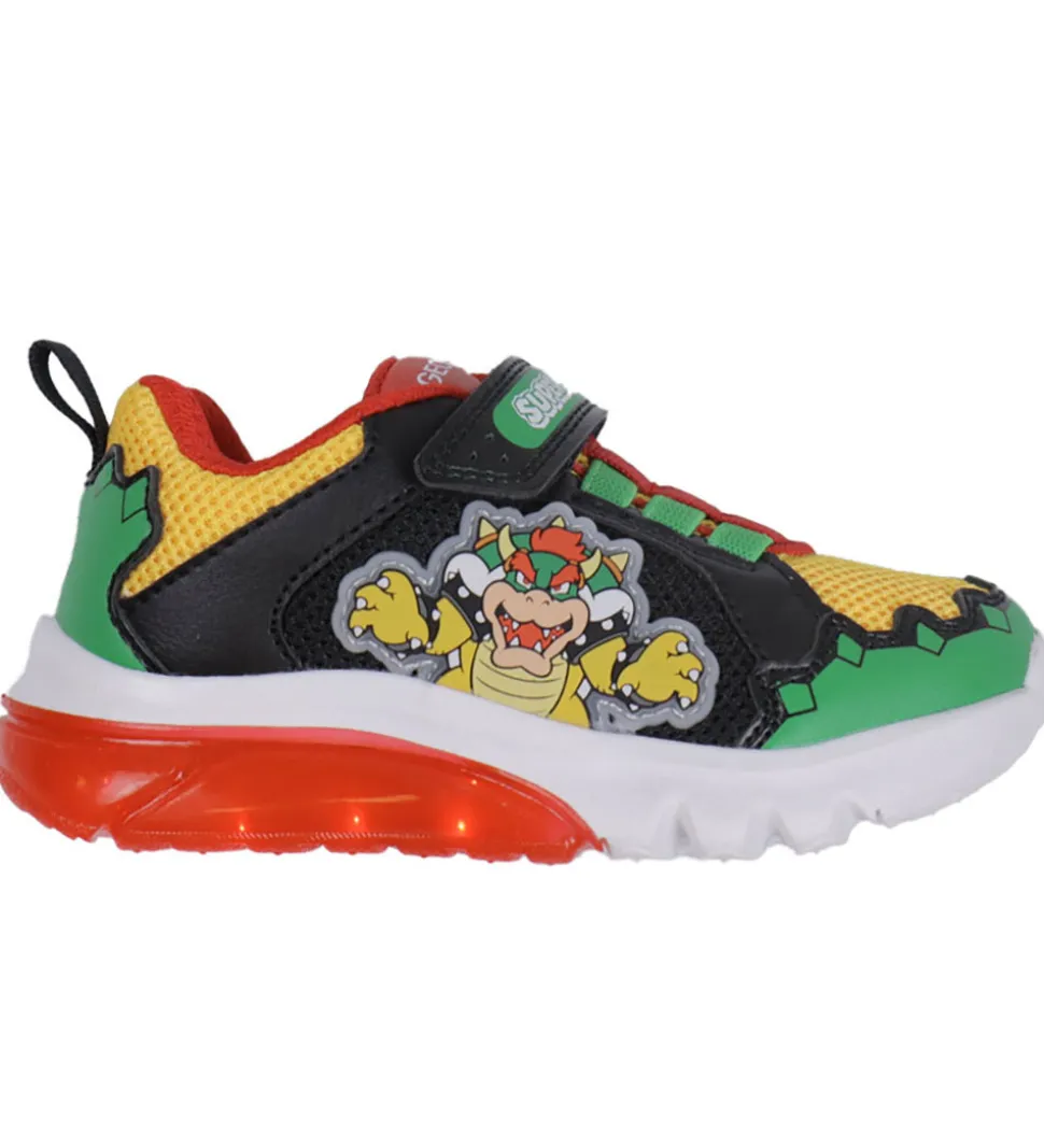 Seje Geox blinkesko med Super Mario tema i rød, gul, grøn og sort. På ydersiden er der en 3D-applikation af figuren “Bowser” fra Super Mario.