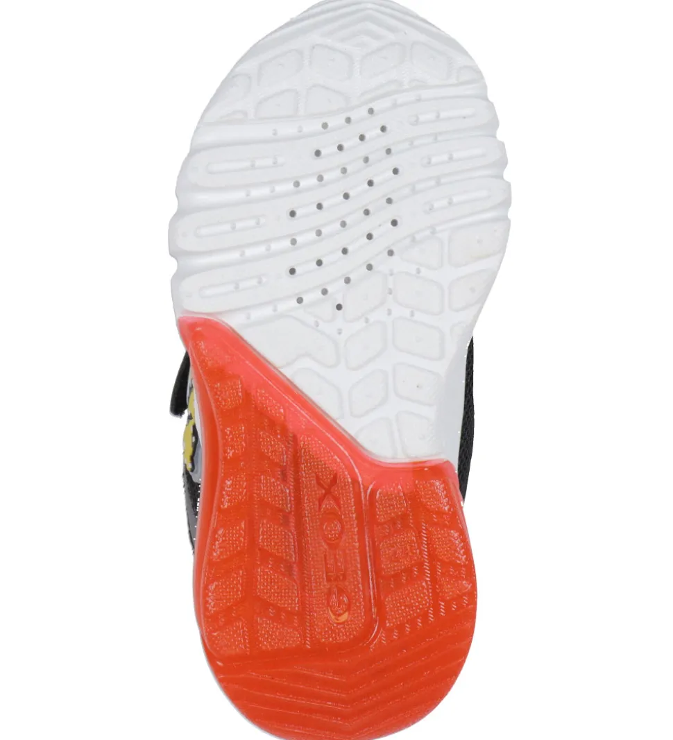 Geox skoene har elastiske snøre over vristen og lukkes øverst med en velcrorem, for nem og hurtig tilpasning. Indvendigt er der rødt mesh med ekstra polstring omkring åbningen og udtagelige indersåler med små ventilationshuller.