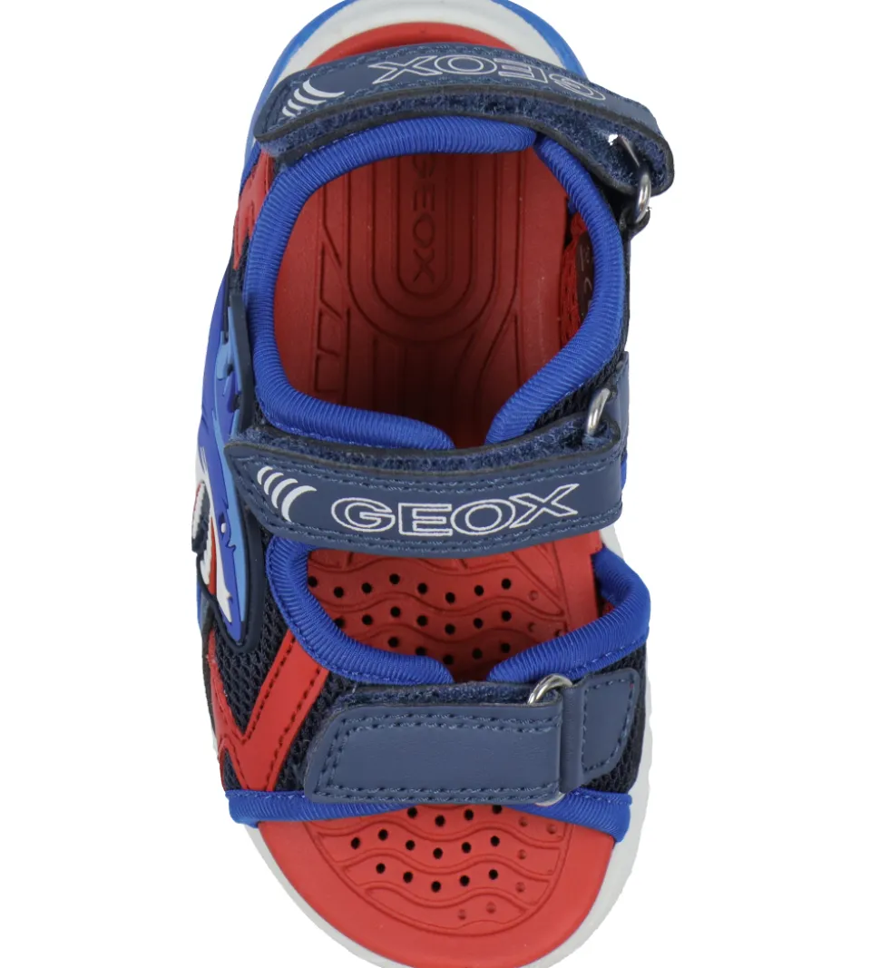 Smarte Geox sandaler i rød og blå, med et print på ydersiden af en haj og teksten “Geox” i hvid på velcroremmene. Det bagerste på hælen er i et blåt, gennemsigtigt gummi med LED-lys som blinker når barnet går eller løber. LED-lysene kan tændes på indersiden og er ikke genopladelige.
