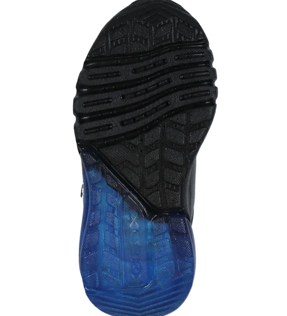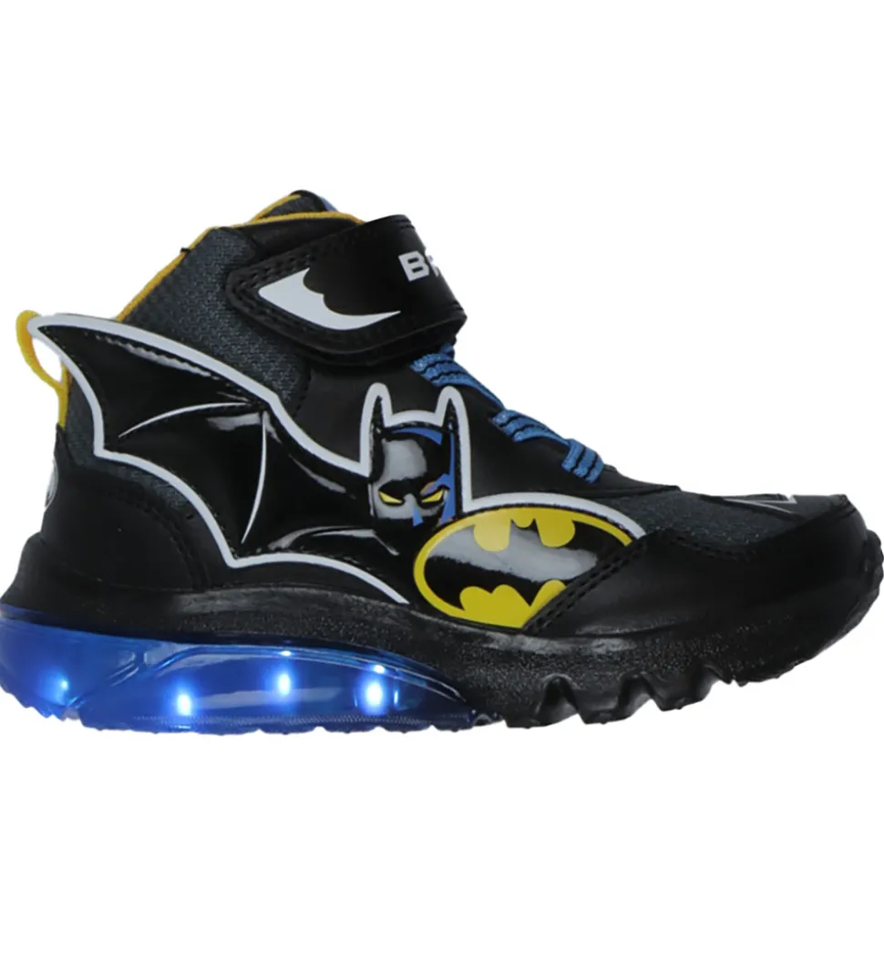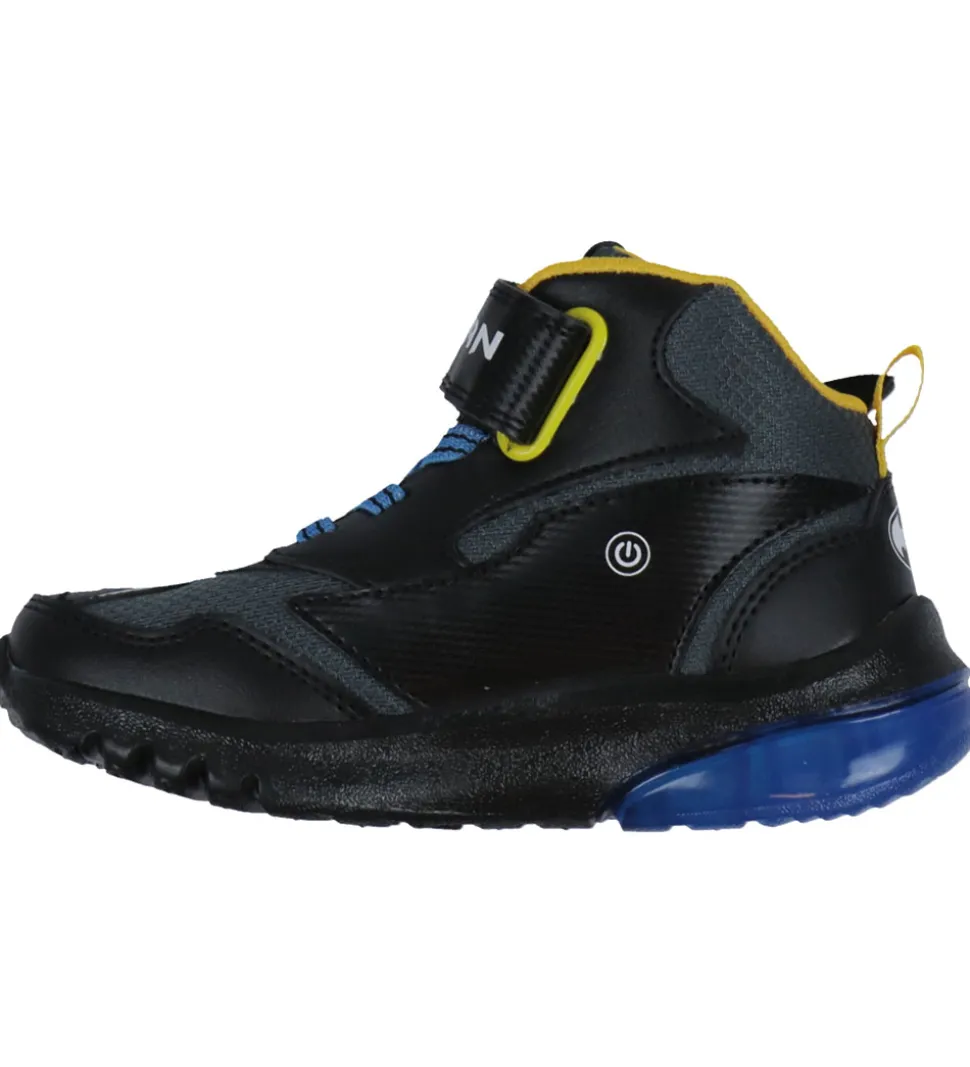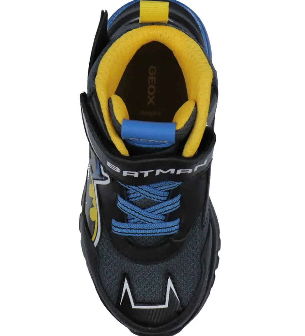 Seje Geox støvlerne af tekstil og imiteret skind i sort med sejt Batman-design og gult -logo. På ydersålerne ved hælen er der blinkende LED-lys i blå.