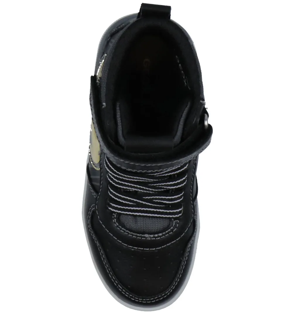Flotte Geox støvler af tekstil og imiteret skind i sort og grå og med Batman-design i guld og logoer.