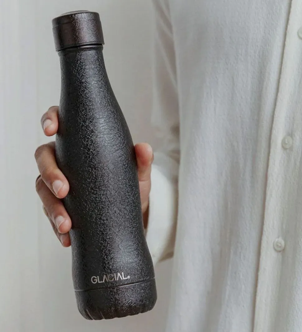 Flot Glacial termoflaske i ensfarvet sort i en skøn struktur med et logo fortil.