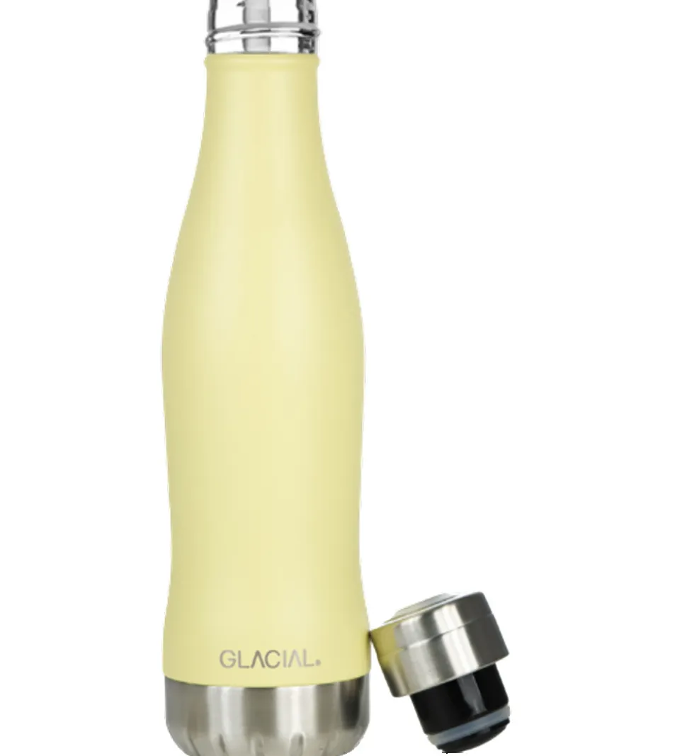 Skøn Glacial termoflaske i gul med stål i top og bund.