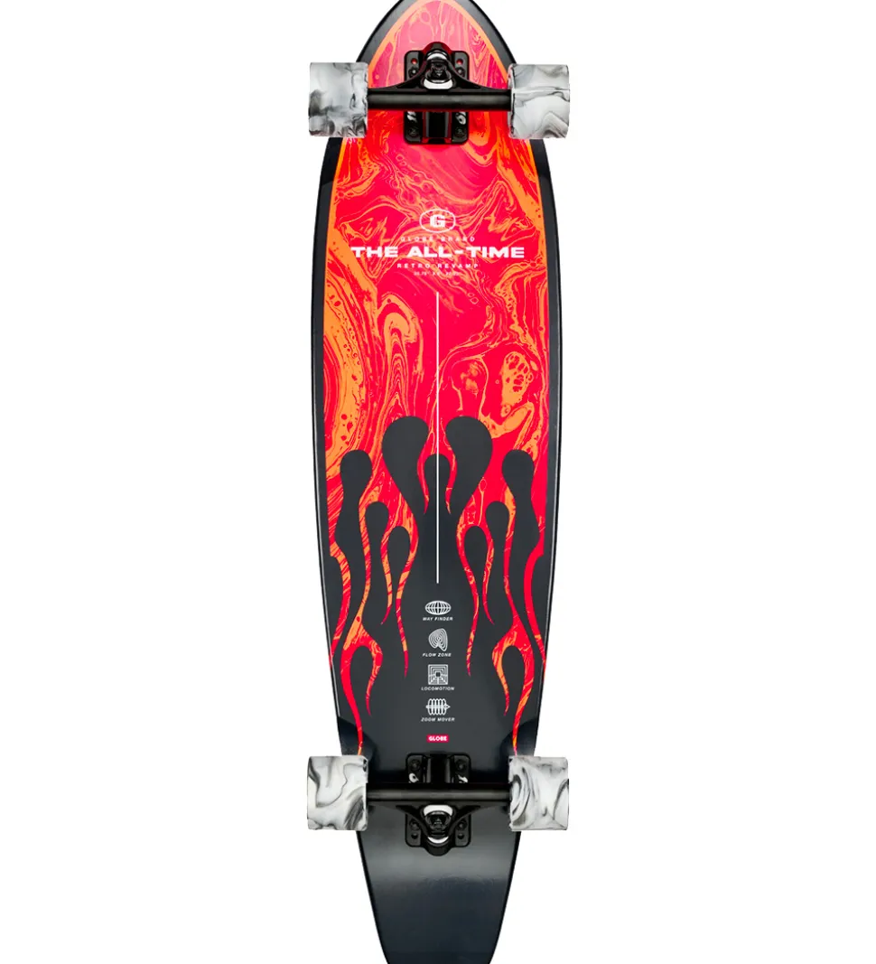 Sejt Globe longboard i sort med et rødt og orange flammeprint og jhulene er sorte og hvide med et marmor-look.