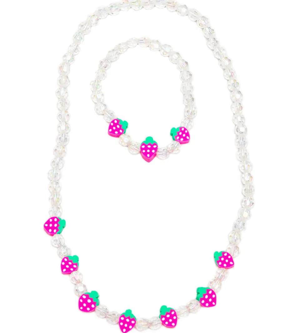 Flot Great Pretenders armbånd og halskæde med hvide, gennemsigtige perler og små jordbær.