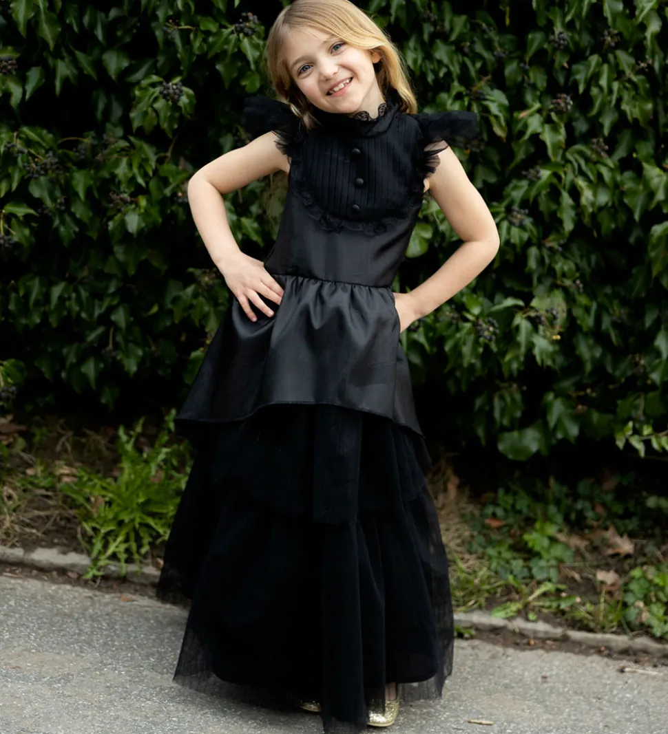 Great Pretenders udklædningen består af en lang, sort kjole med lagdelt tylskørt og lukkes i nakken med velcro.