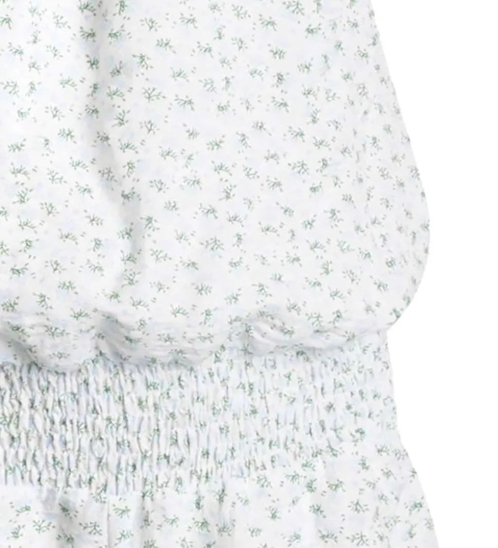 Sød Grunt buksedragt i hvid med et allover print af små lyseblå blomster med grønne stilke og blade.