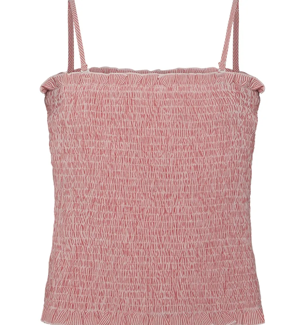 Grunt toppen er uden ærmer og den har smalle, justerbare skulderstropper, som kan tages af. Øverst er der elastik med silikone, så toppen bliver siddende, hvor den skal. Toppen er i en flot smock struktur, og den er produceret i en blød og strækbar kvalitet.