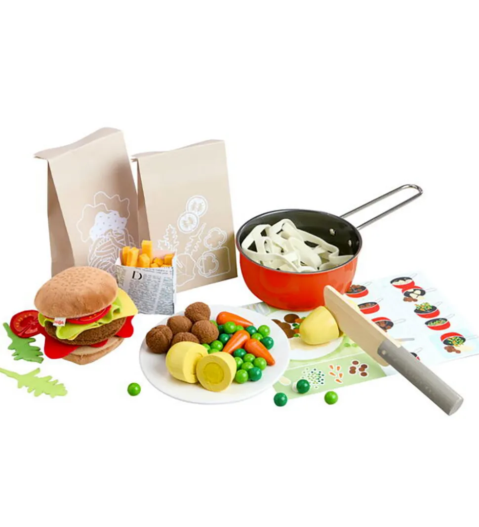 HABA madlavningssættet indeholder blandt andet 19 forskellige opskrifter på aftensmad, herunder burgere, pomfritter, grøntsager, en gryde og take-away poser, der giver børnene mulighed for at lege sjove madlavningslege.