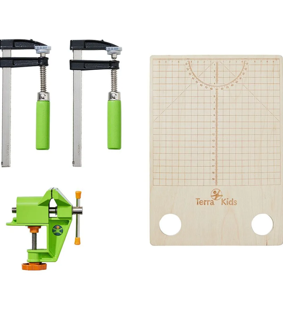 Sjovt Haba Terra Kids værktøjssæt med en skruestik og to skruetvinger.