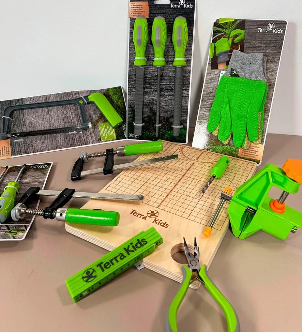 Haba Terra Kids værktøjet er i børnestørrelse, så det passer til mindre hænder. Skruestikken er beklædt med selvklæbende skumgummi, så den ikke laver mærker i træet. Der medfølger en stykke krydsfiner med forskellige typer lineal trykt på den ene side, så barnet kan lære noget om målestok og vinkler. Skruetvingerne kan gabe over 4,5 cm.