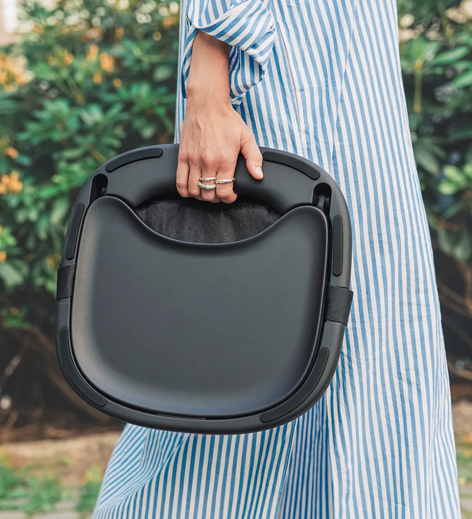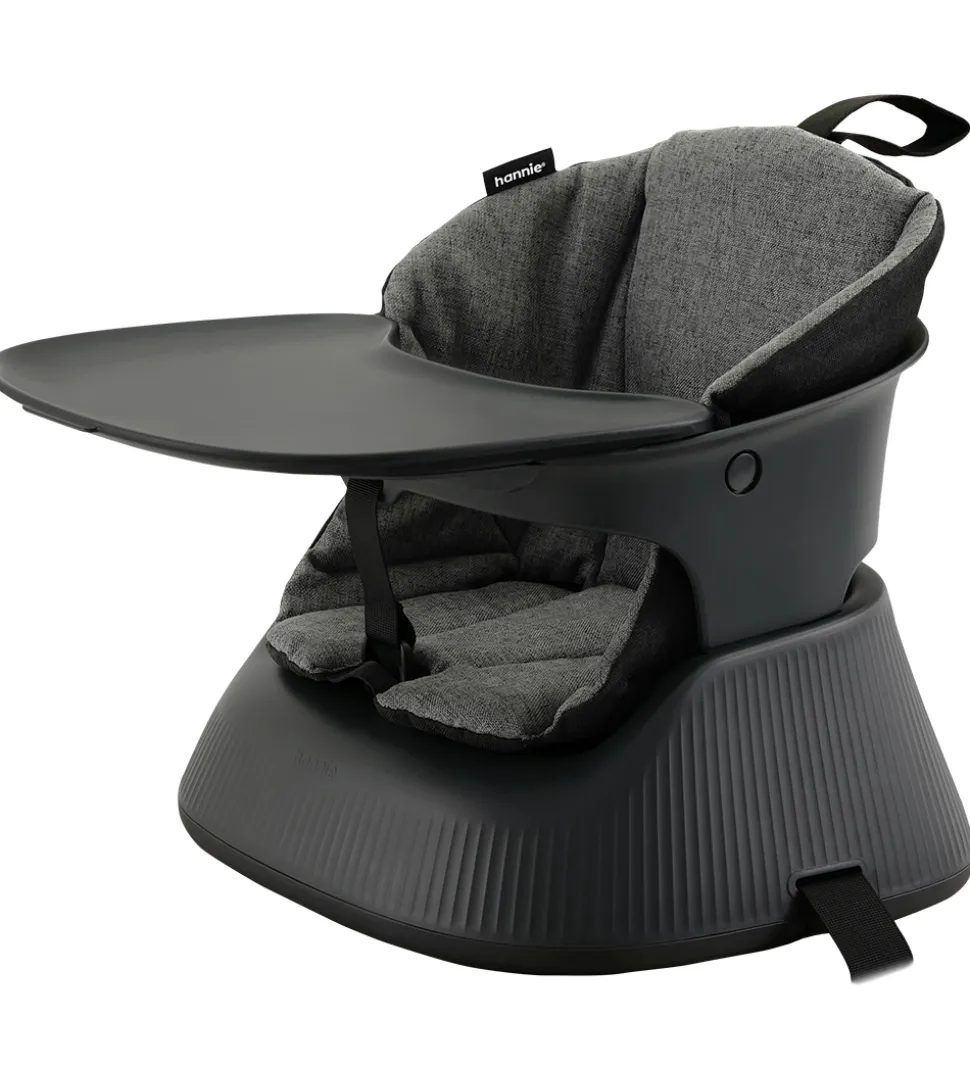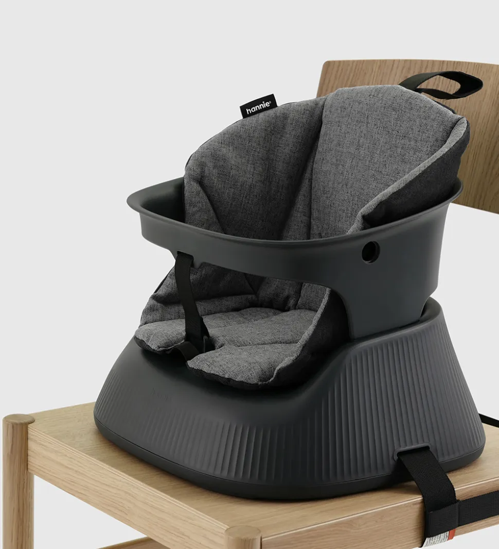 Praktisk Hannie transportabel højstol i ensfarvet sort med en vendbar hynde i sort på den ene side og gråmeleret på den anden side.