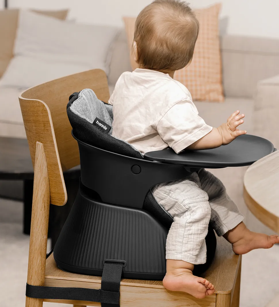 Sædeforhøjeren monteres let og sikkert på en stol med remme med klikspænder, og barnet spændes fast med en 3-punktsele, så det sidder godt og sikkert. Når barnet er stort nok til at sidde uden støtte, kan man fjerne babydelen. Alle dele passer ned i sædeforhøjeren, og bakken klikkes på som låg, så højstolen er let at transportere.