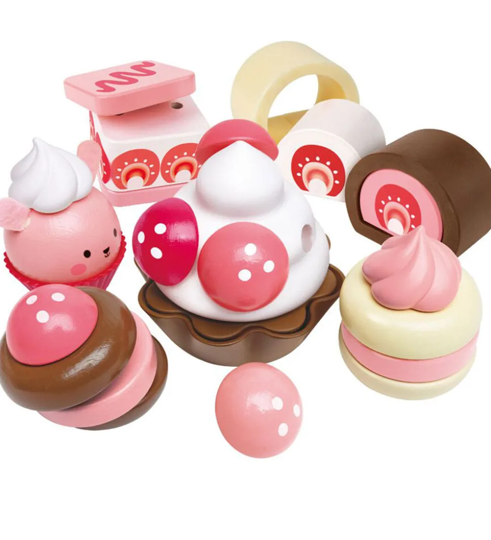 Hape sættet indeholder en lækker menu med roulade, flødekager, cupcakes og tilbehør til desserterne. Sættet er perfekt til børn, der elsker rolleleg, og gør madlavningslegen komplet.